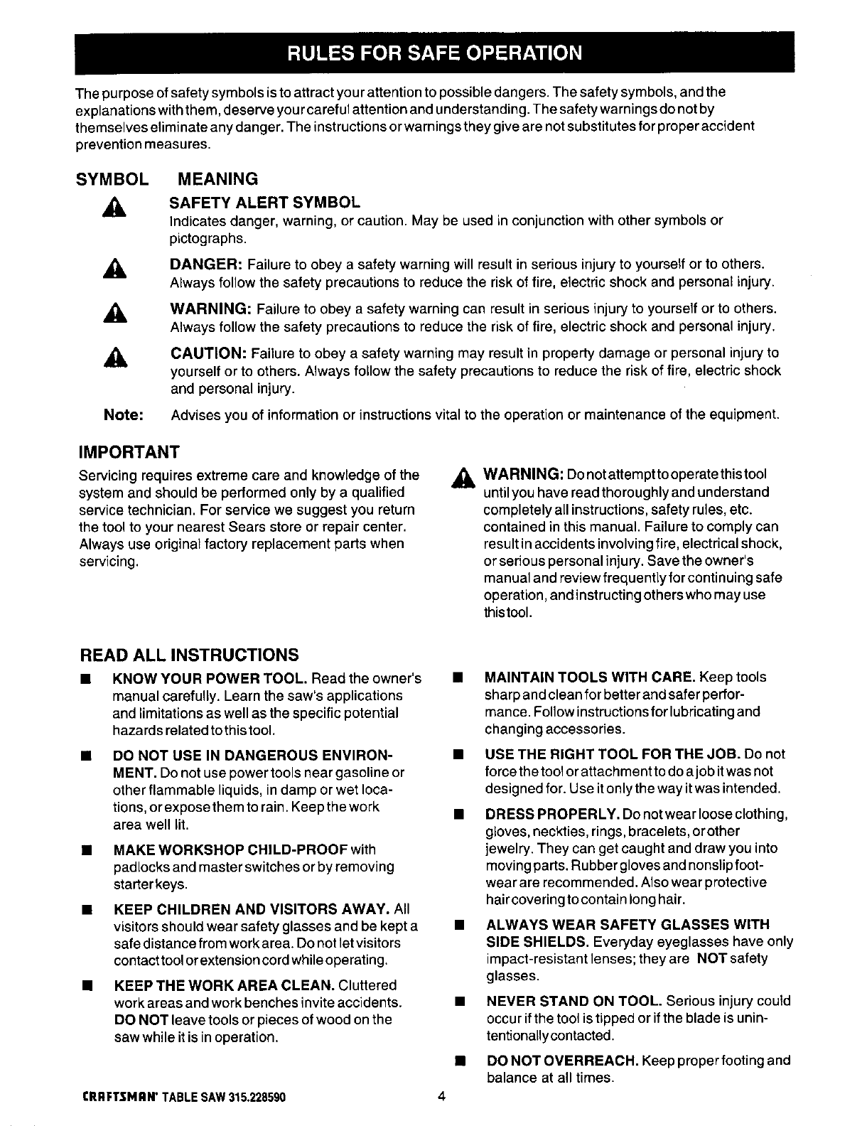 attention to the Rules For Safe Operation, and all Safety Alert Symbols, including Danger, Warning and