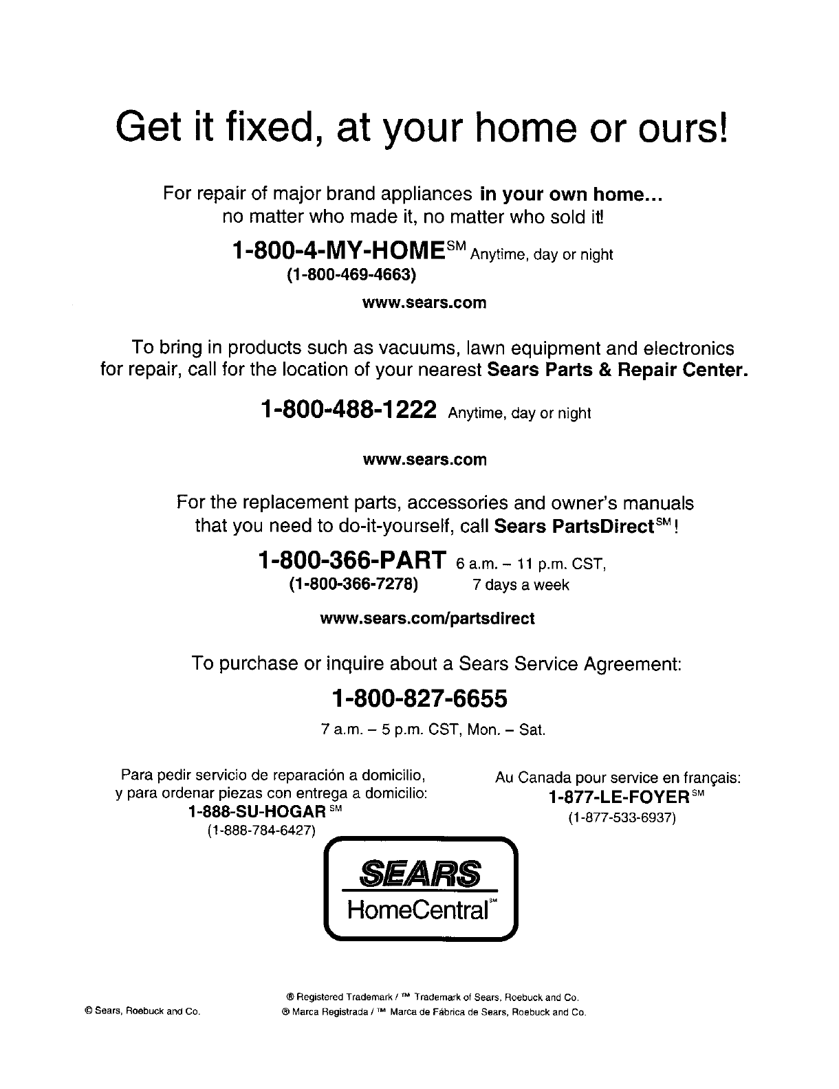 for repair, call for the location of your nearest Sears Parts & Repair Center.