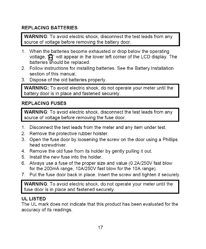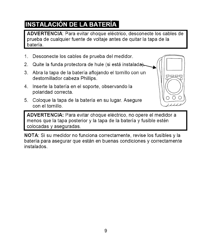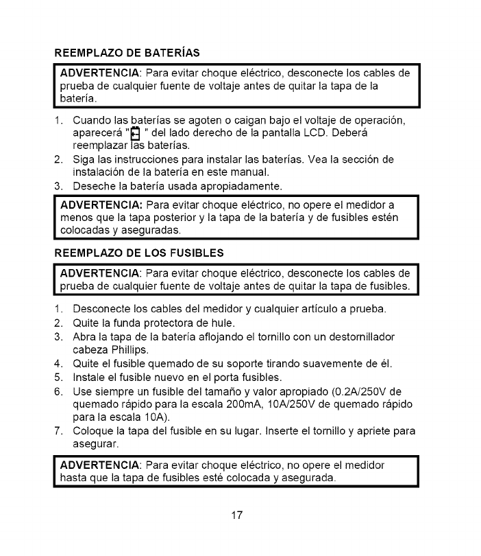 I ADVERTENCIA: Para evitar choque electrico, no opere el medidor Ihasta que la tapa de fusibles este colocada y asegurada,
