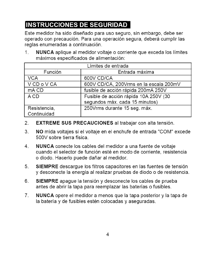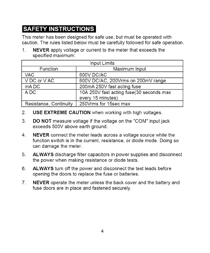 1. NEVERapplyvoltageorcurrenttothemeterthatexceedsthe