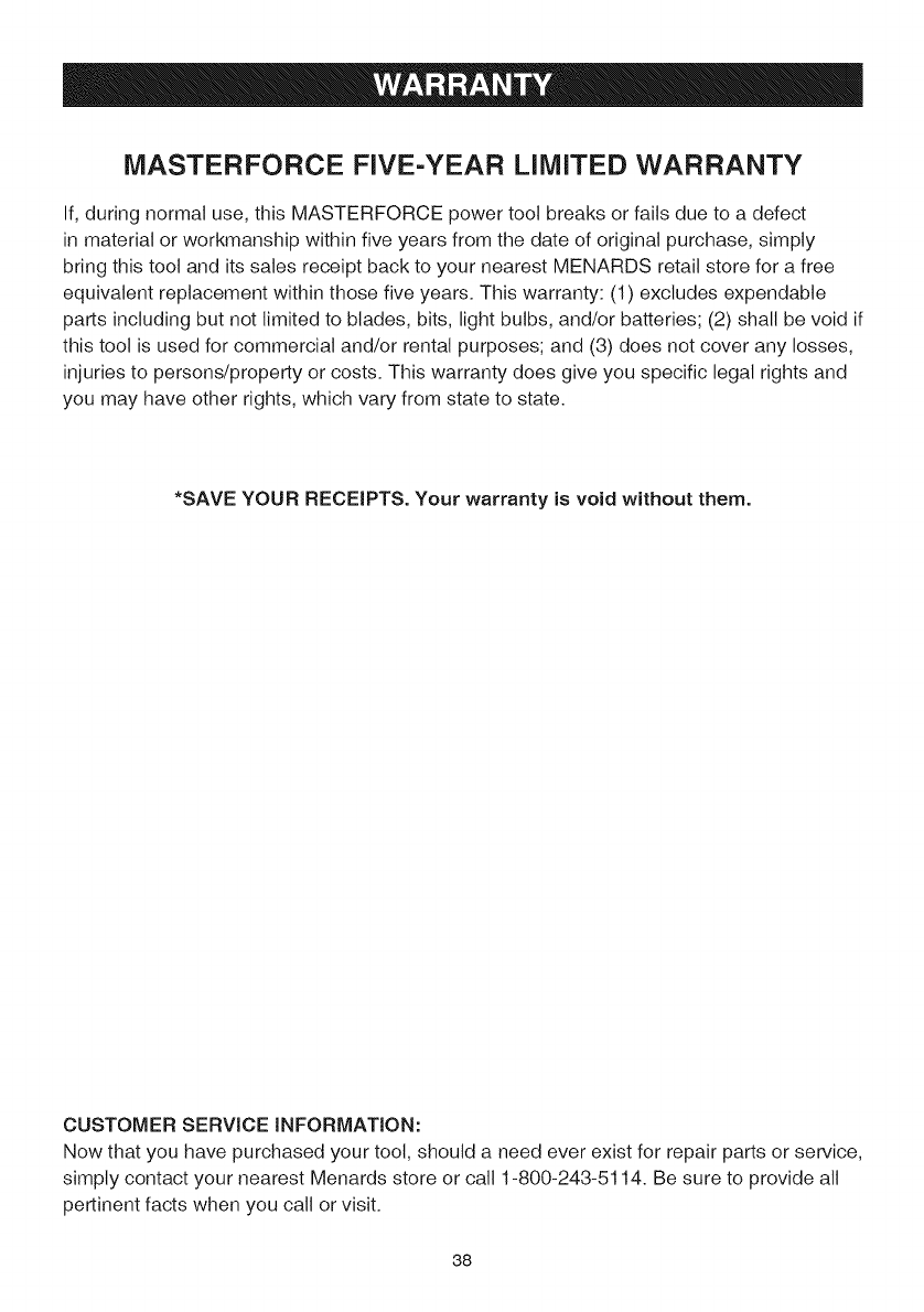 MASTERFORCE FIVE=YEAR LiMiTED WARRANTY