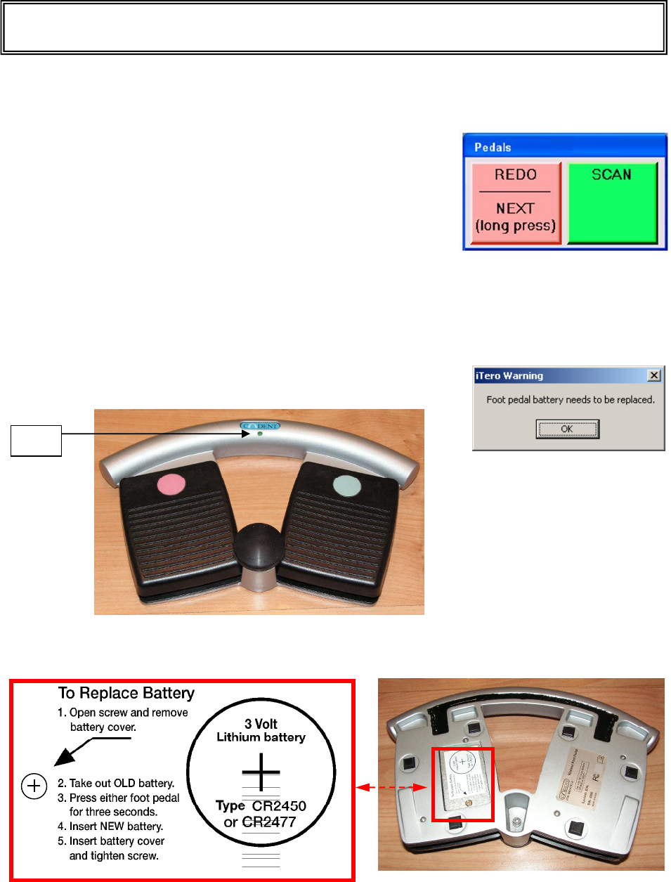 Pressing either foot pedal turns on the green LED. The battery needs to be replaced if any of
