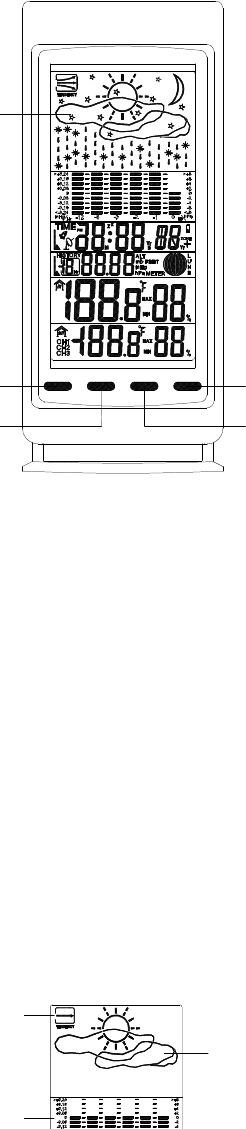 The main unit tracks fluctuations in barometric pressure every 30 minutes and the trend indicator is shown on the left side of the weather icons. When the indicator points upwards, the weather improves; when the