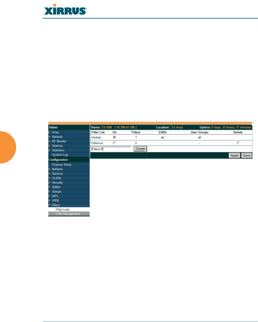 name, state (enabled — on or off), and type (allow or deny) of each filter is shown.