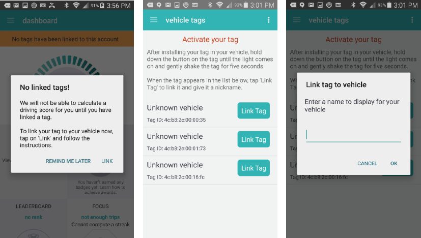 the DriveWell app’s dashboard; a green banner saying “Tag connected” will
