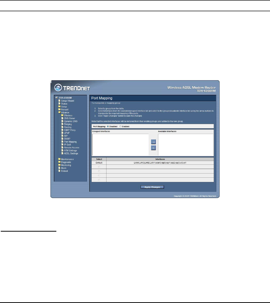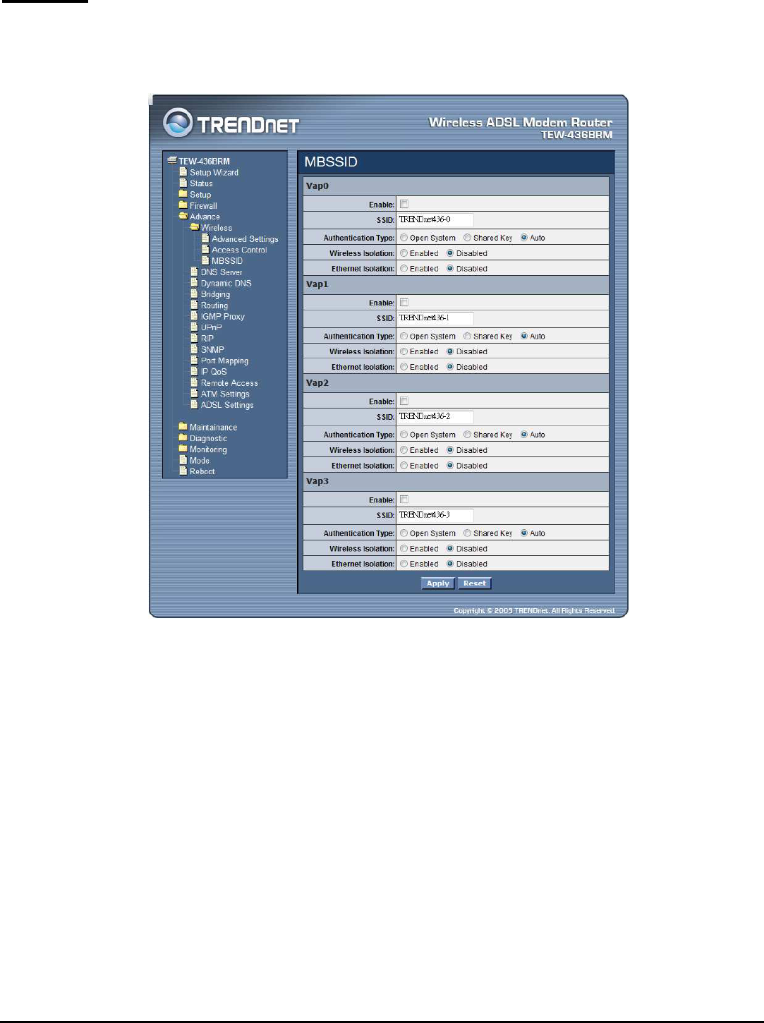The WLAN ADSL Router supports up to four virtual AP (Vap0~Vap3) setting