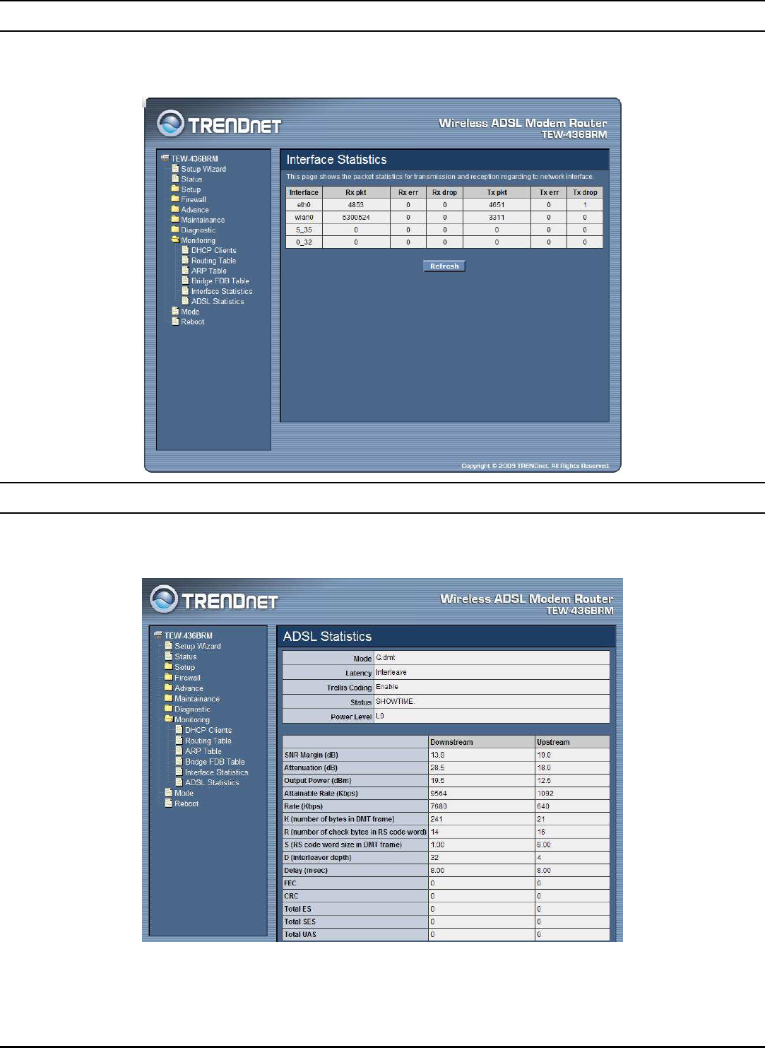 This page shows the packet statistics for transmission and reception regarding to the
