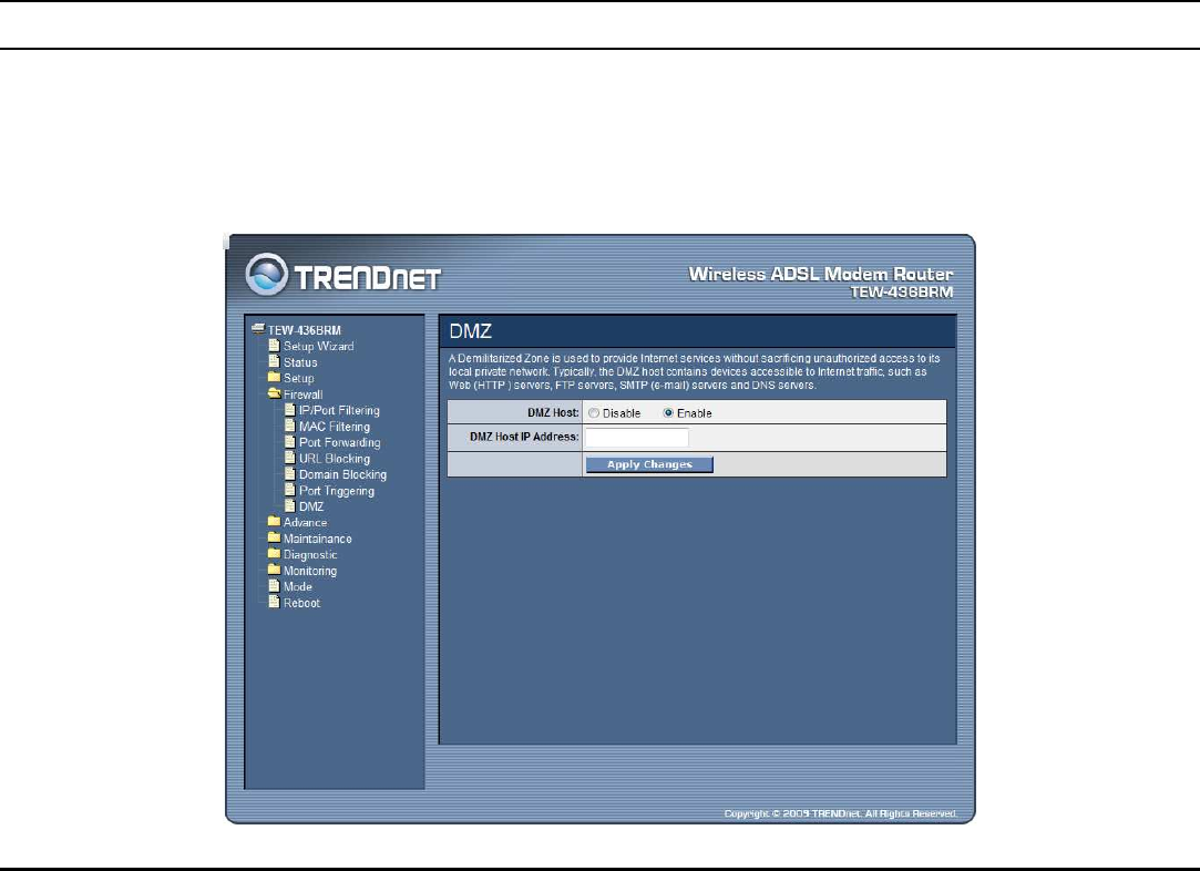 DMZ Host IP Address: Enter a IP address of the local host. This feature sets a