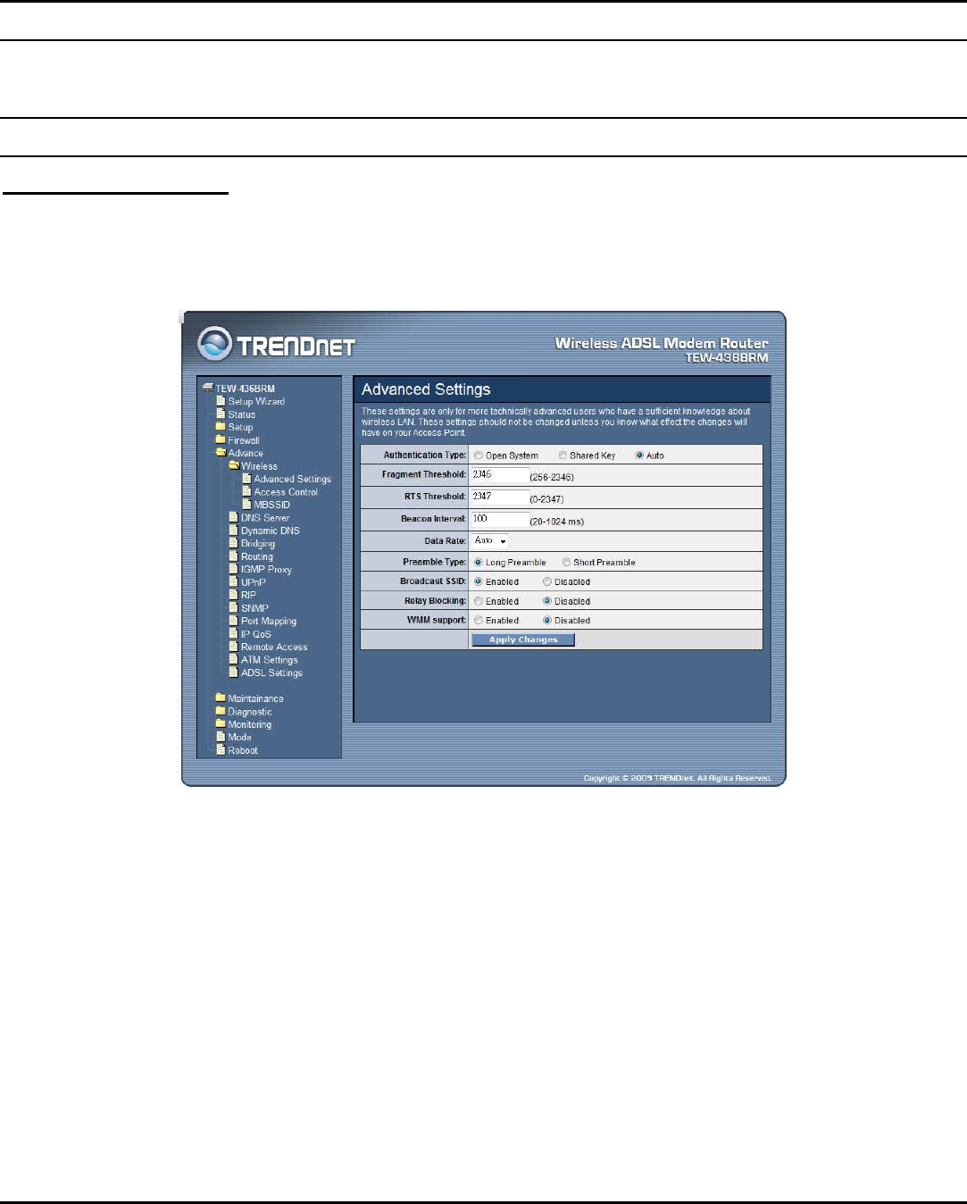 The Advance setting is for the WLAN ADSL Router is configured on Router mode