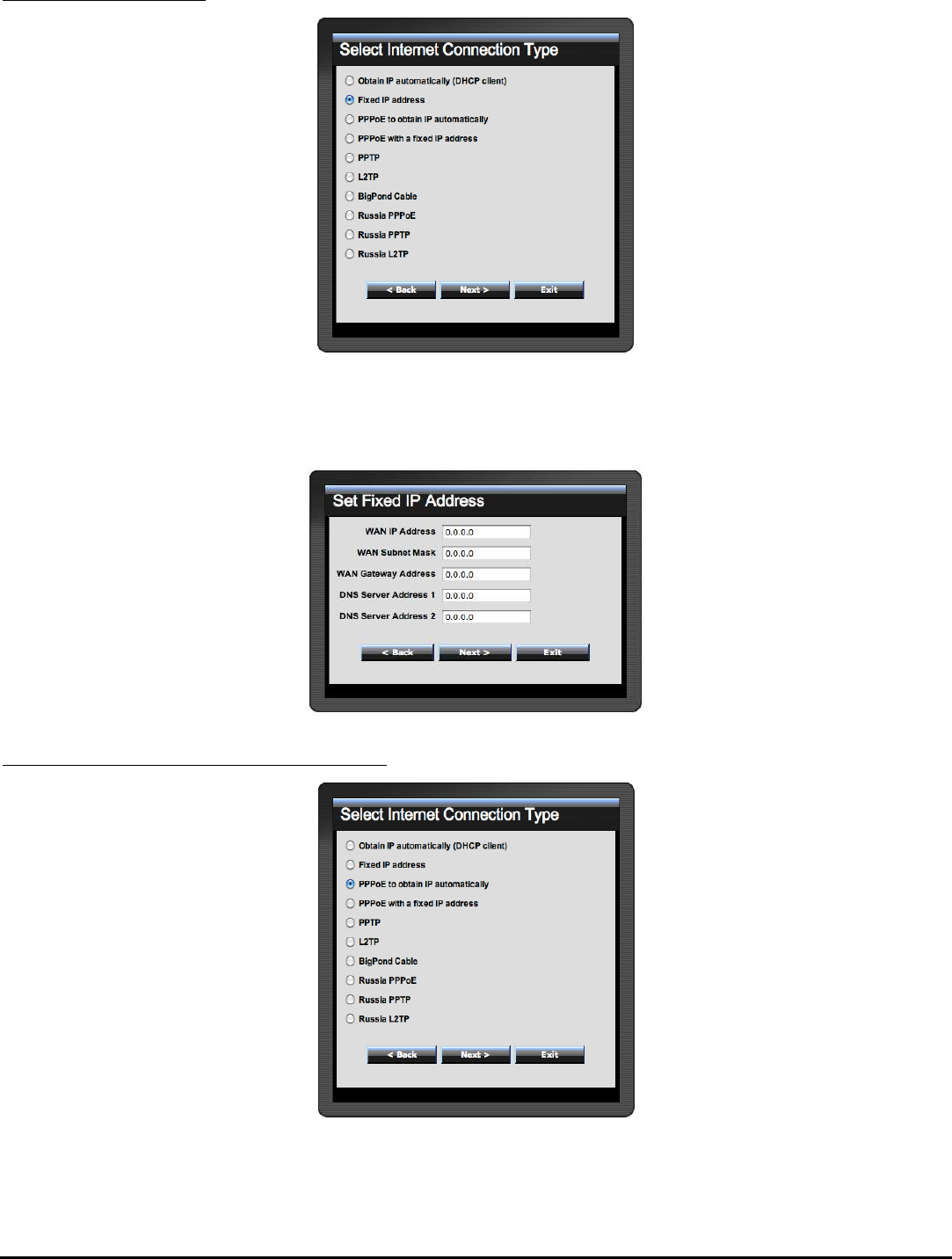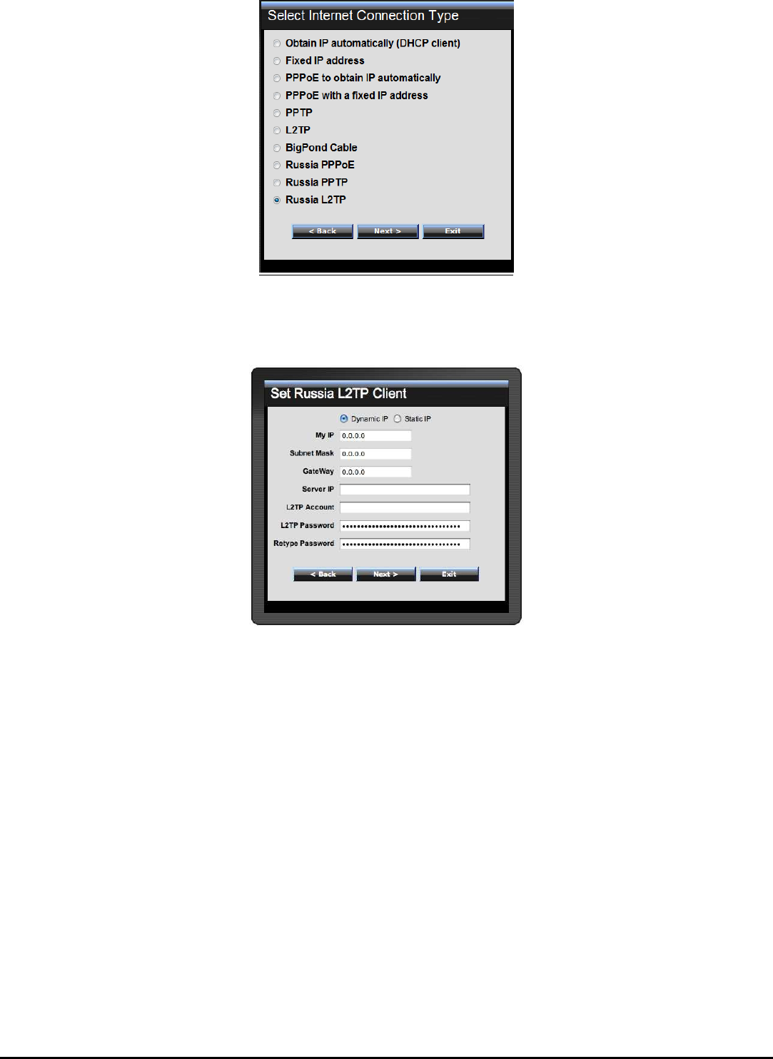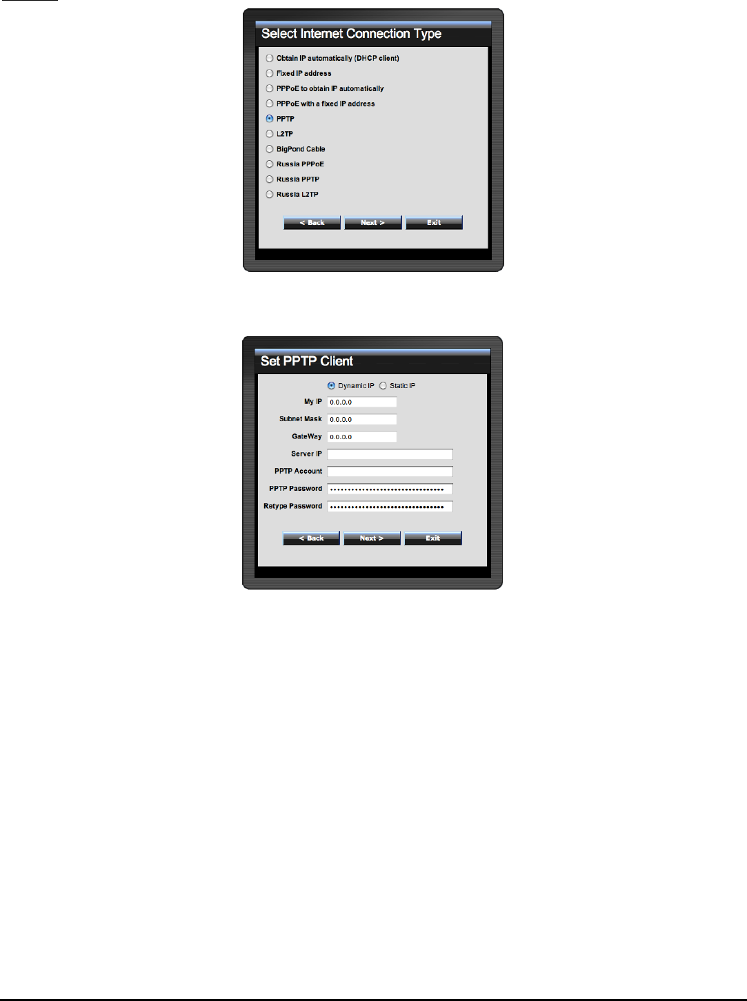 Type Dynamic IP, Static (Fixed) IP, PPPoE, PPTP, L2TP,