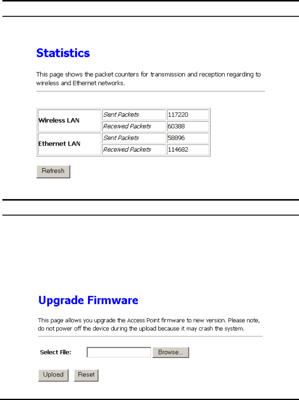 This screen shows the packet counters for transmission and reception