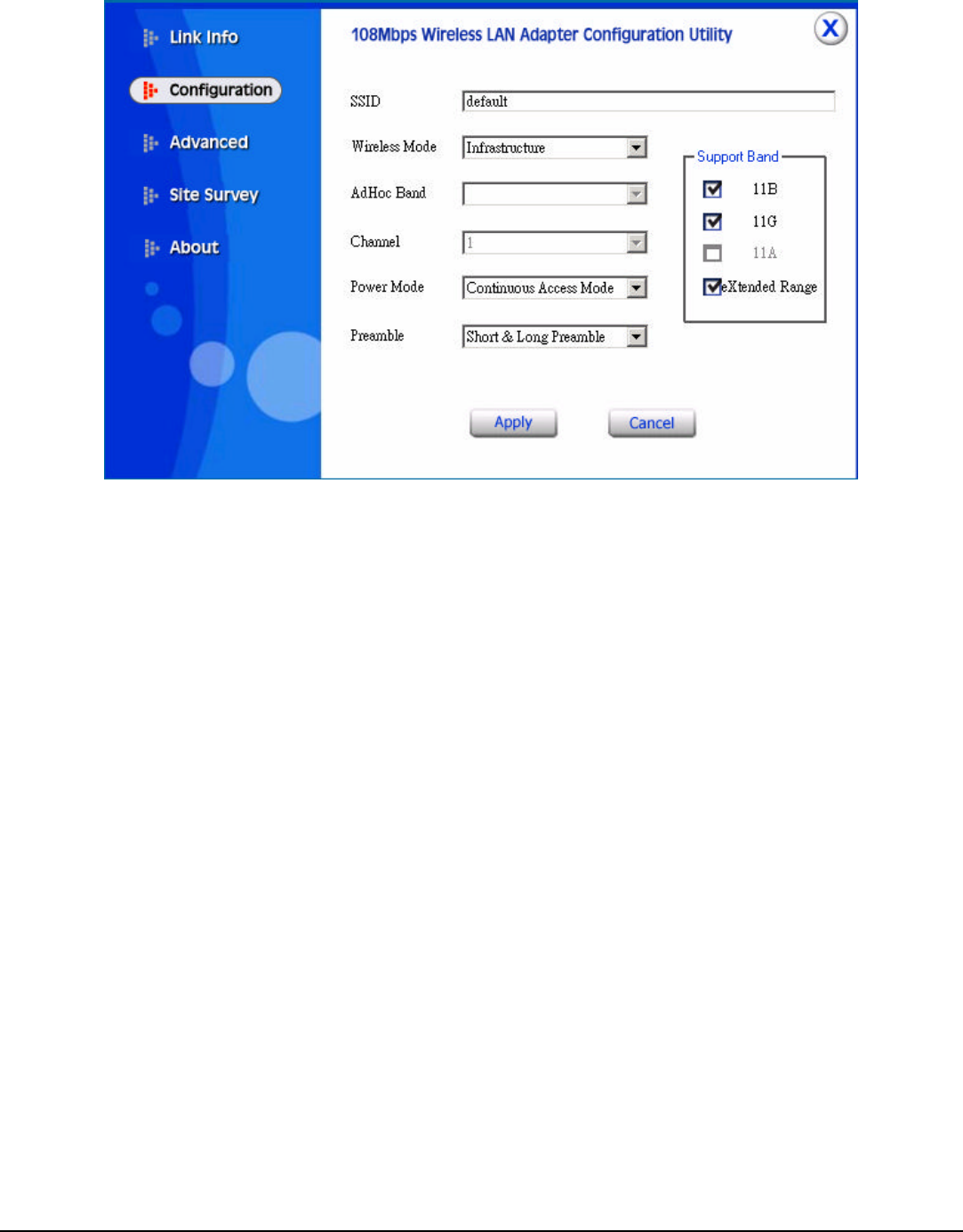 eXtended Range. The default setting is 11B, 11G and eXtended Range enable,