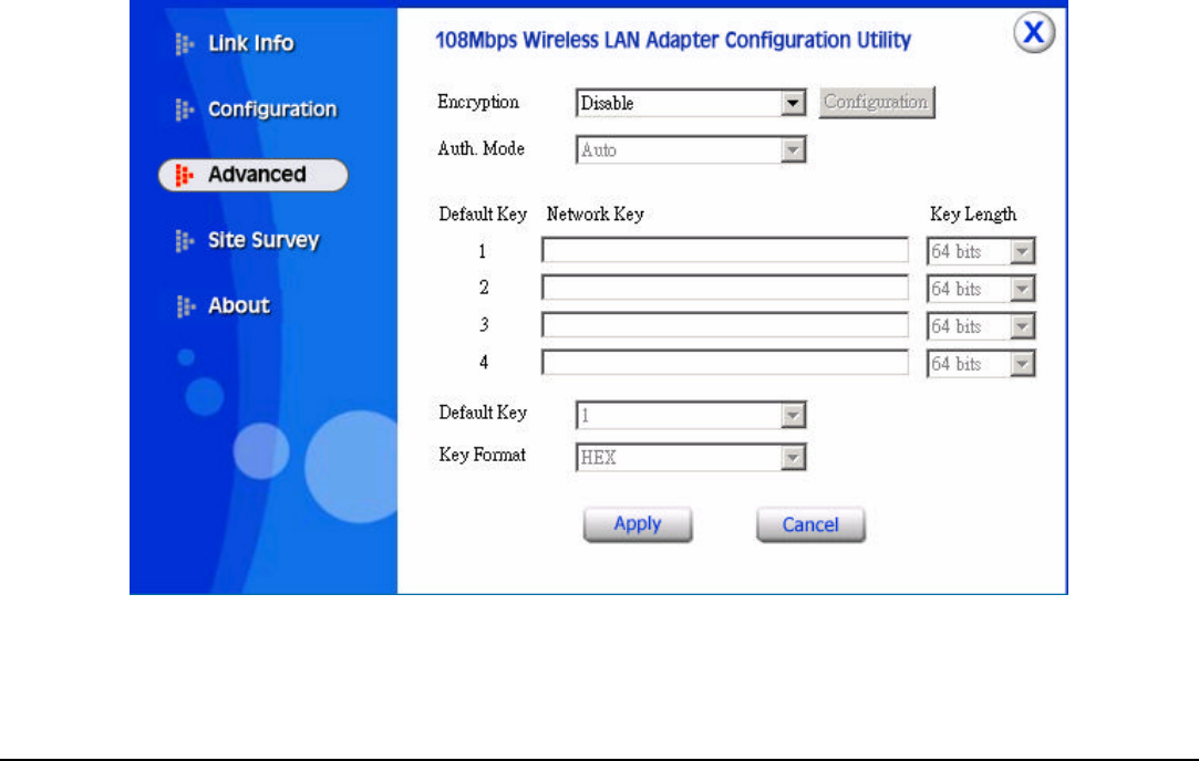 This is the page to configure Security settings of 108Mbps wireless LAN PC card.
