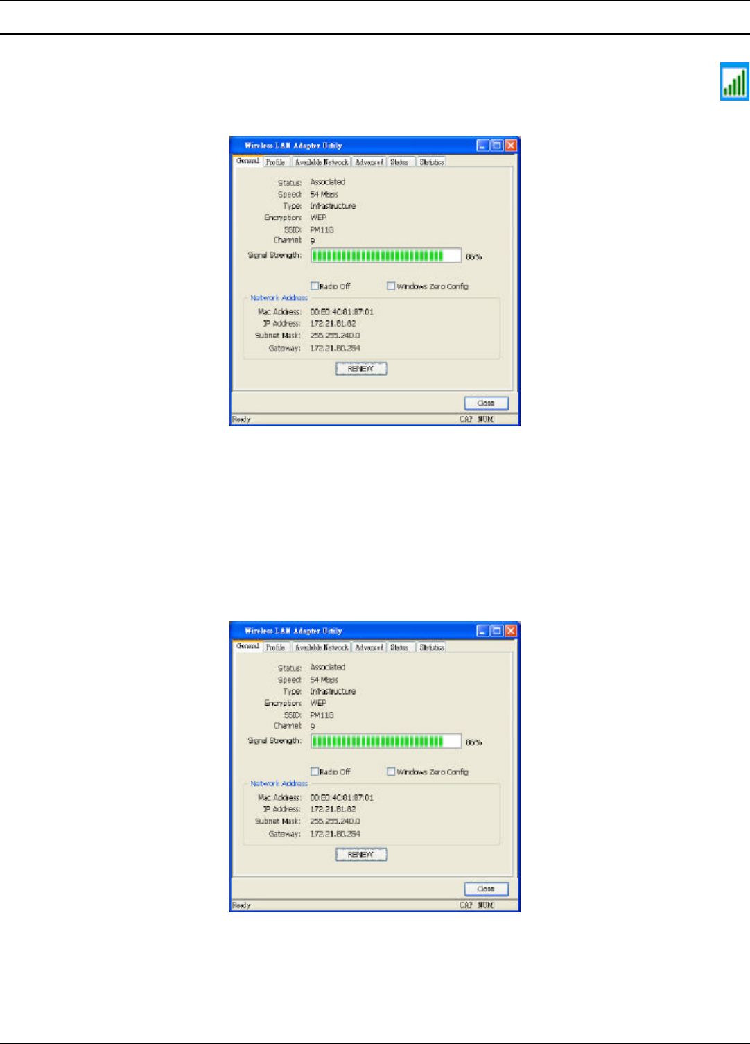 The Status section shows you the detail information of the Wireless Adapter, it