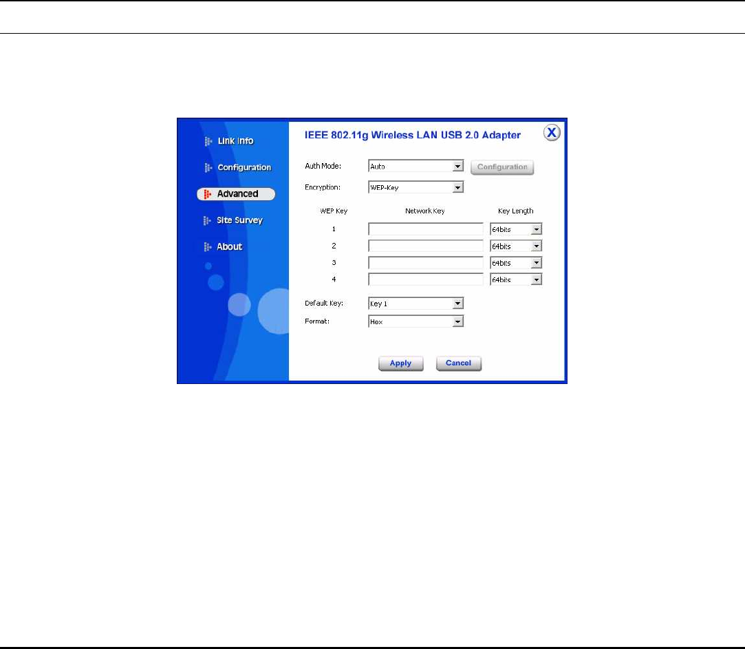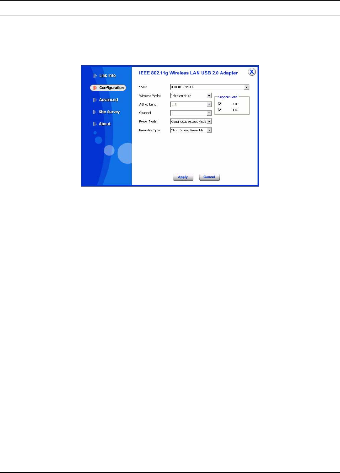 The About section shows you the 802.11g Wireless USB 2.0 Adapter information,