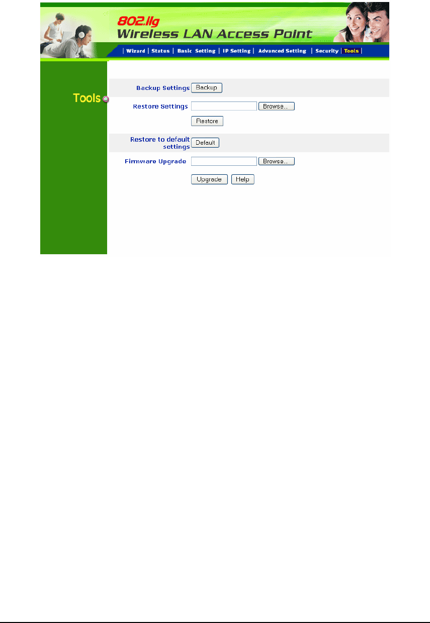 Four functions are provided in this page, Backup, Restore Settings, Restore