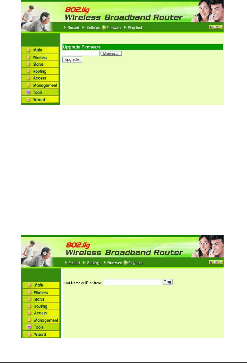 settings, upgrade the firmware, and ping remote IP addresses.
