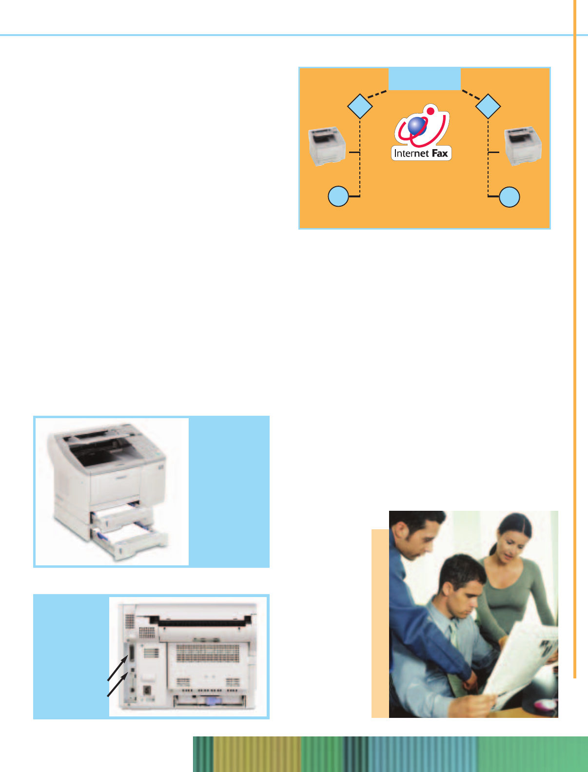enables Internet faxing, network printing, and scan-to-E-mail capabilities via a 10/100Base-T interface, in