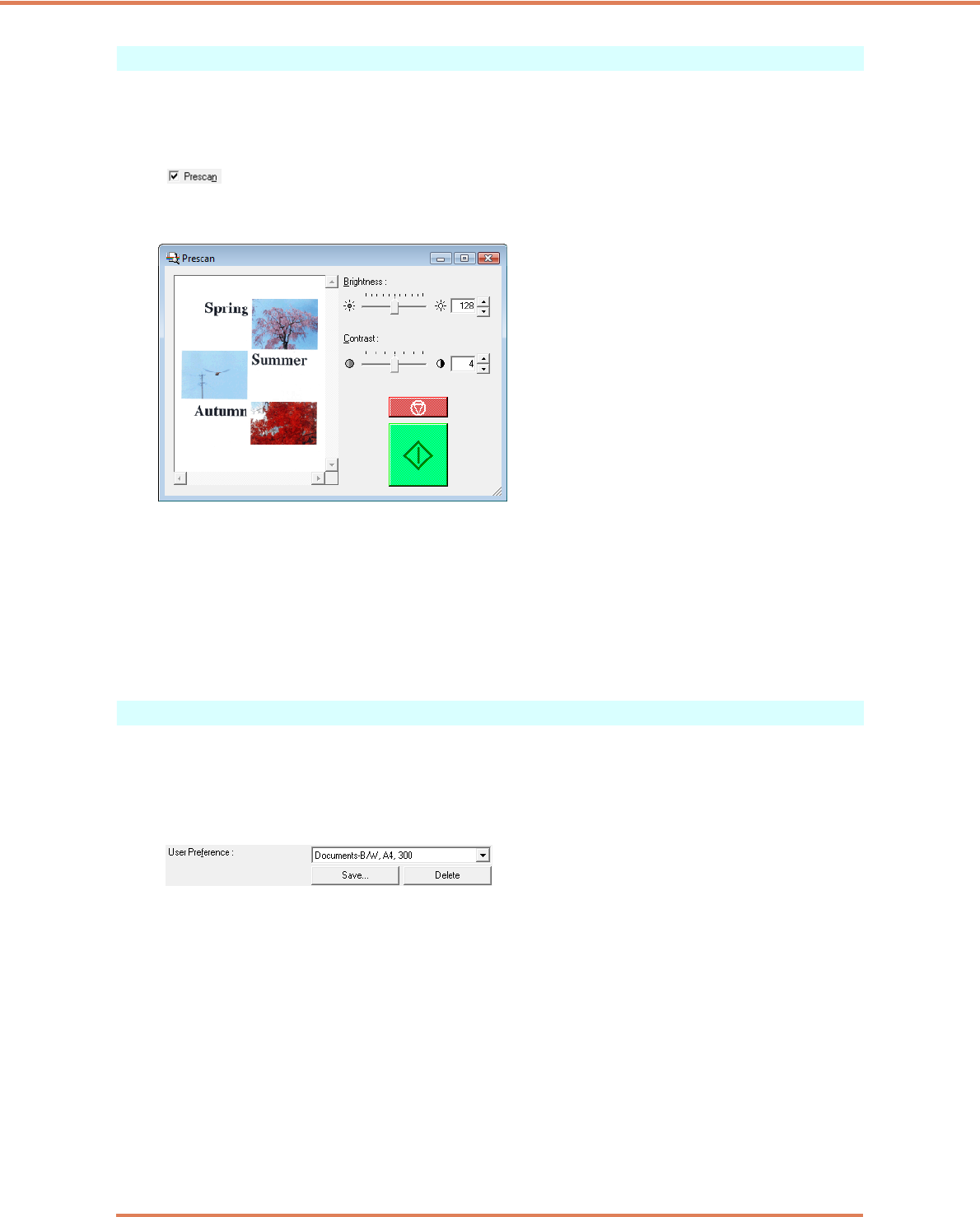 The Prescan window provides adjustments for image brightness and contrast of the first