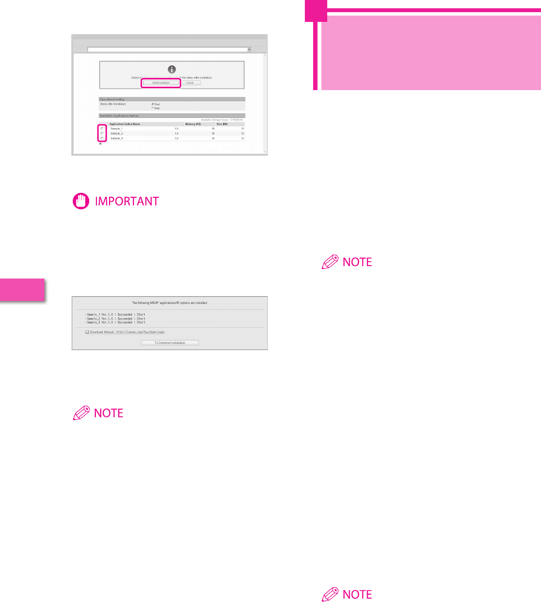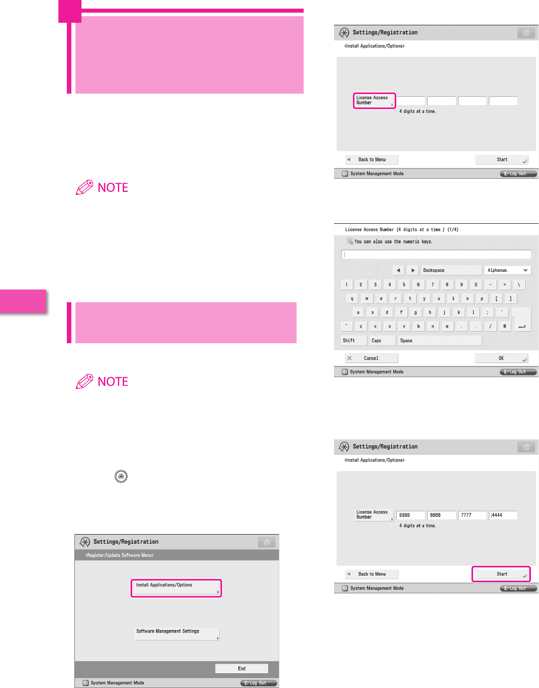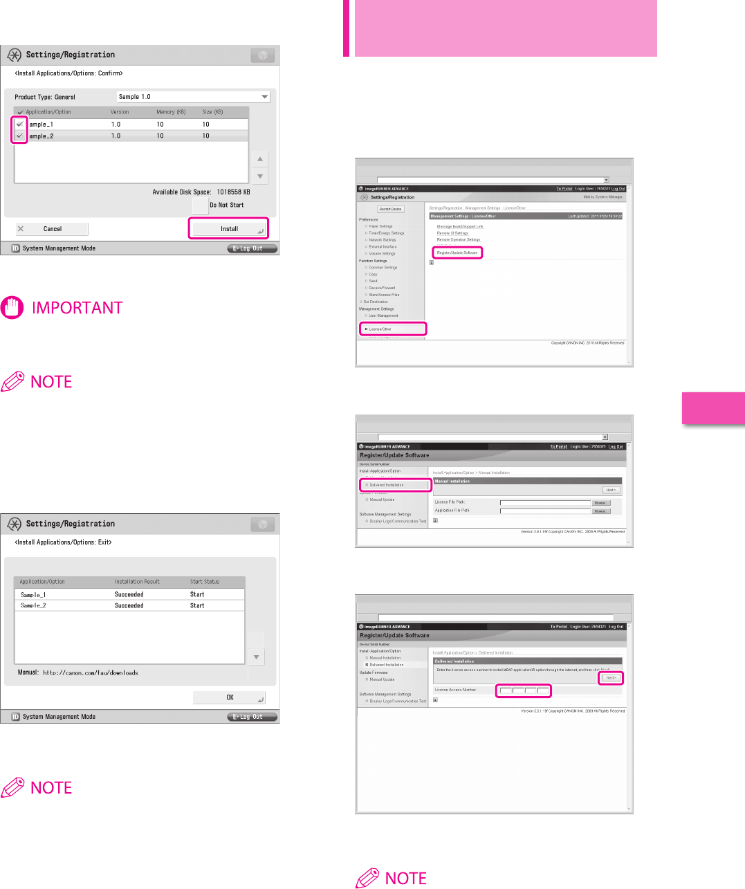 Describes the procedure for installing system options and MEAP applications using the Register/Update