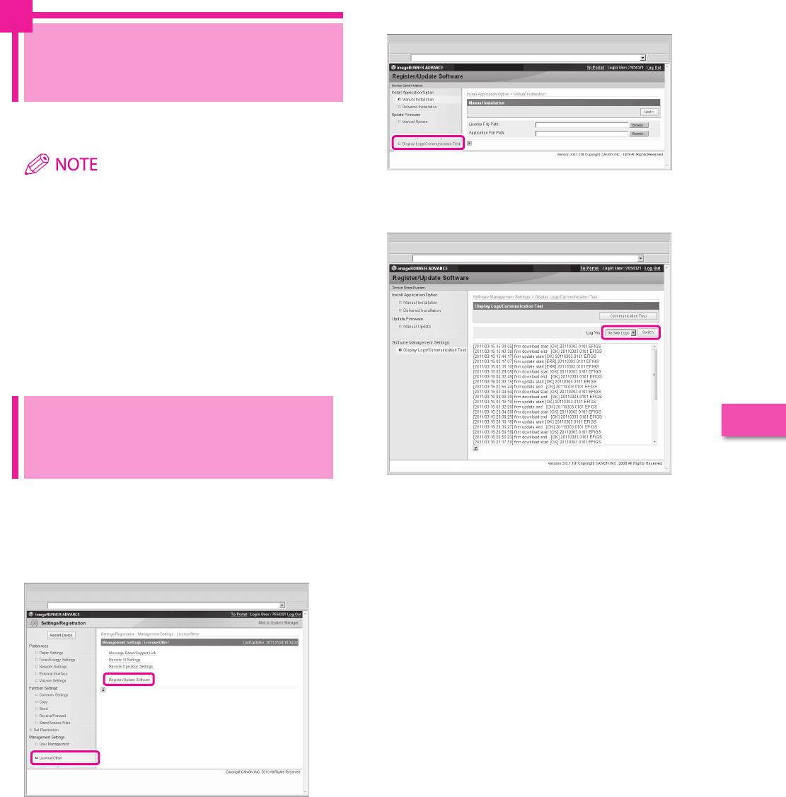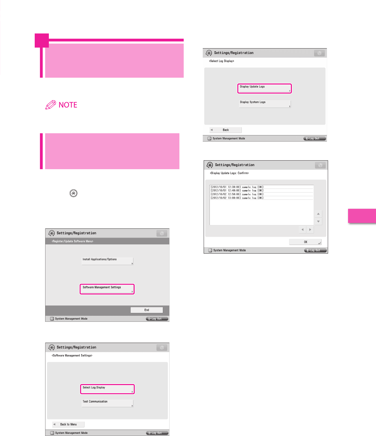 Using the Register/Update Software function, you can check the installation log for system options/MEAP applications and