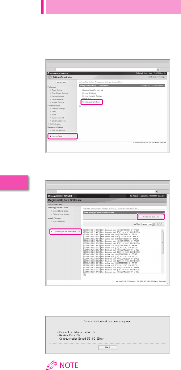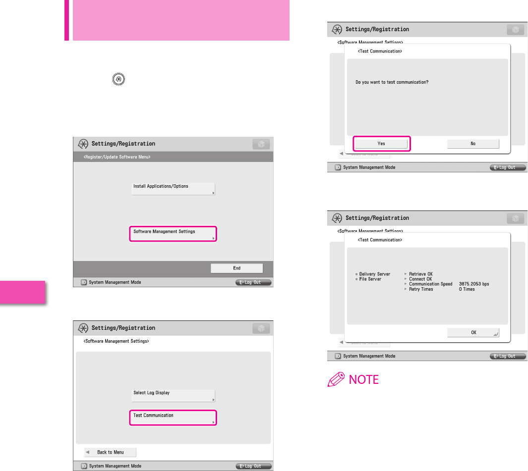 perform communication tests with the delivery server. You can use this function from both the touch panel display and the