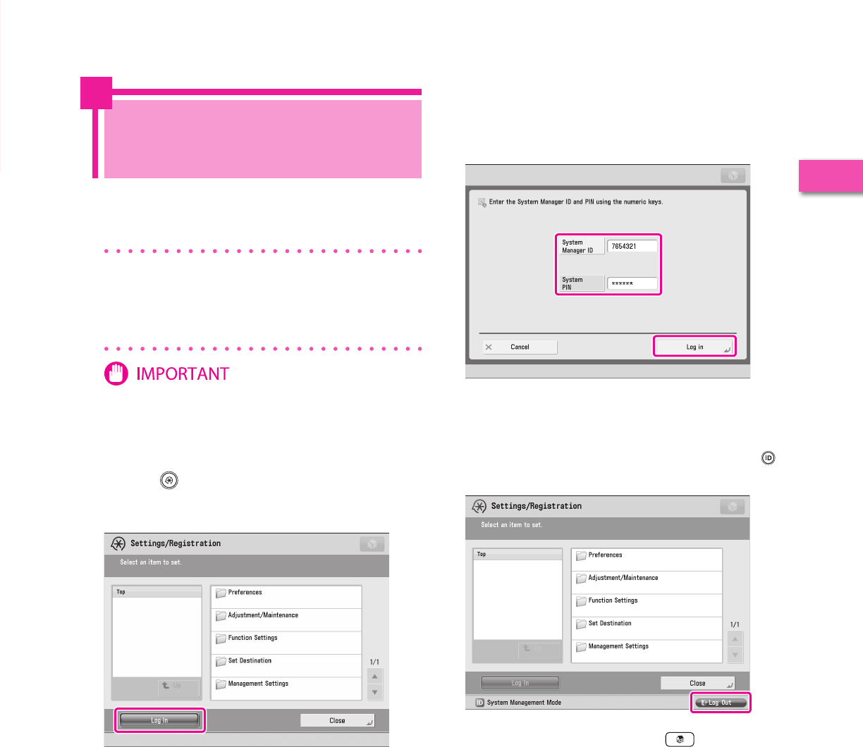 Describes the initial settings required, such as logging in to the machine, and connecting to a network.