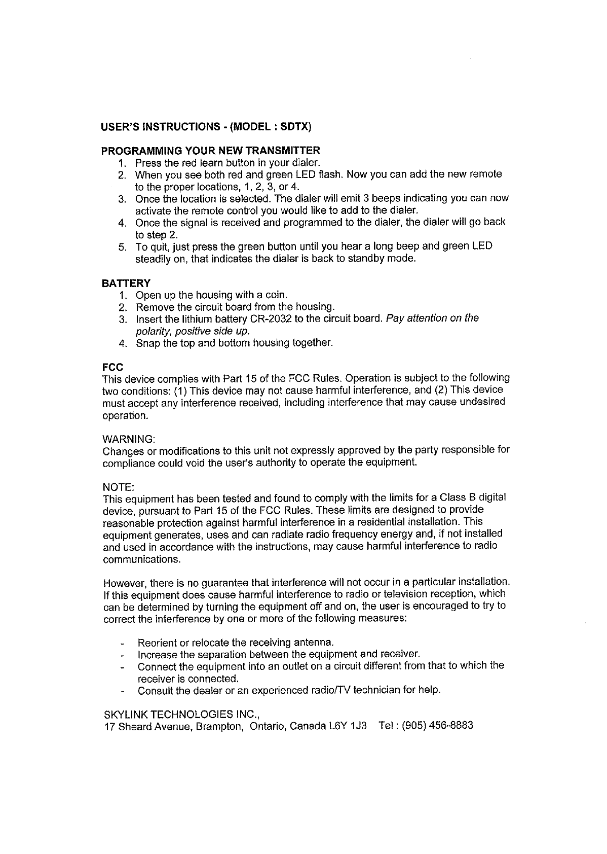 Capital Prospect SDTX Transmitter (315MHz Tx) User Manual