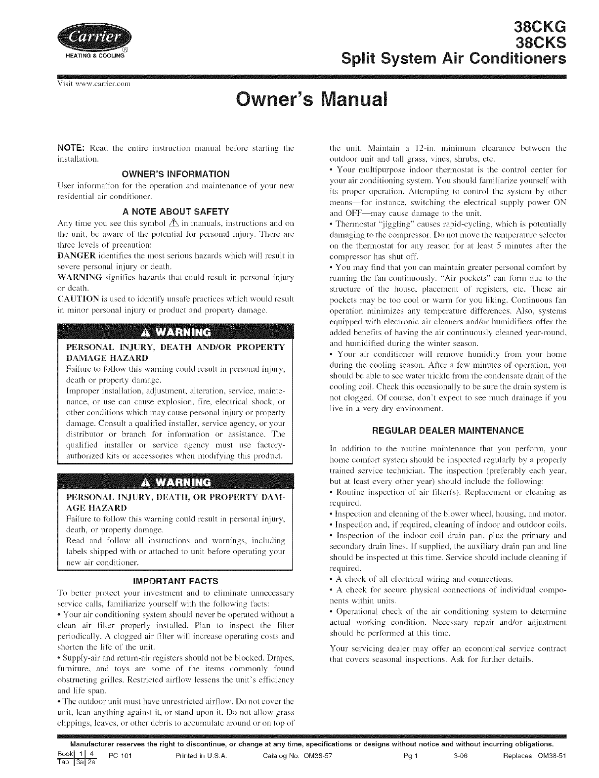 PC 101 Printed in U.S.A. Catalog No. OM38-57 Pg 1 3-06 Replaces: OM38-51
