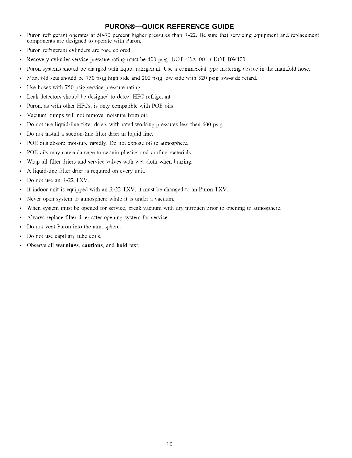Puron refiigerant operates at 50-70 percent higher pressures than R-22. Be sure that servicing equipment and replacement