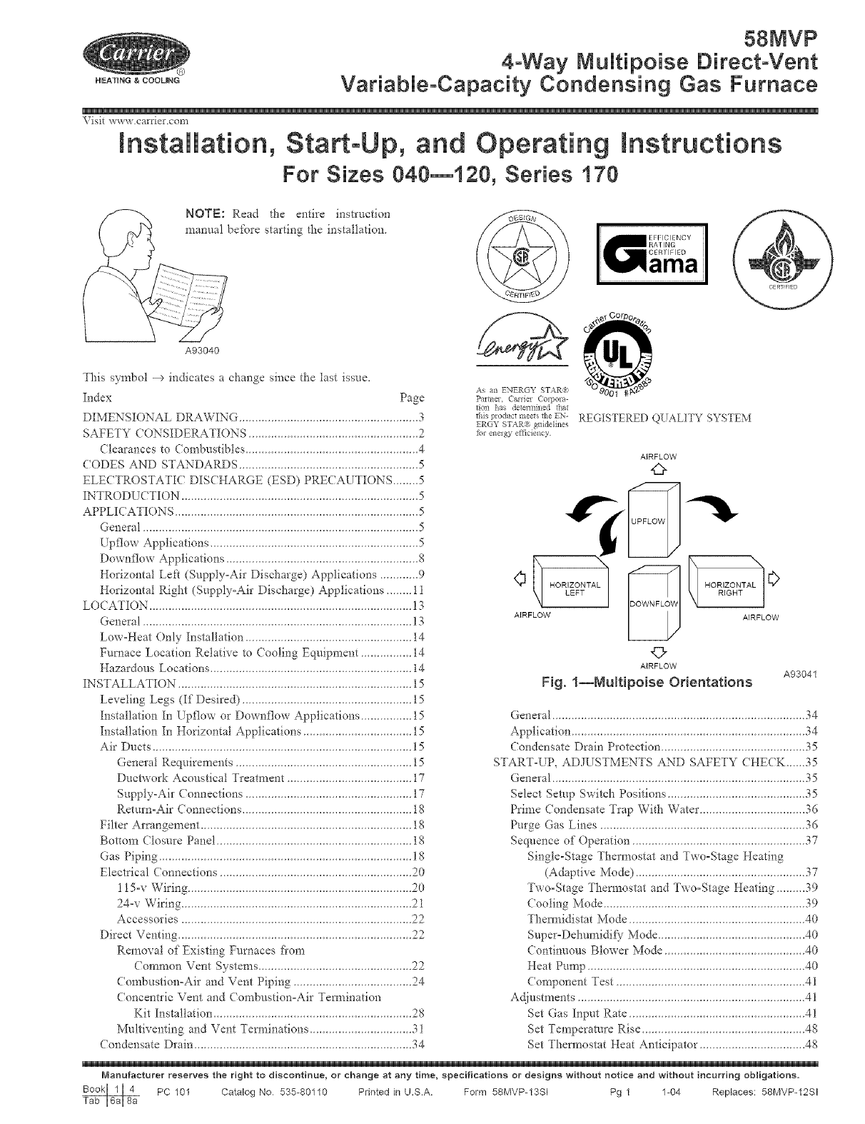 Carrier 58MVP060 User Manual FURNACE Manuals And Guides L0411125