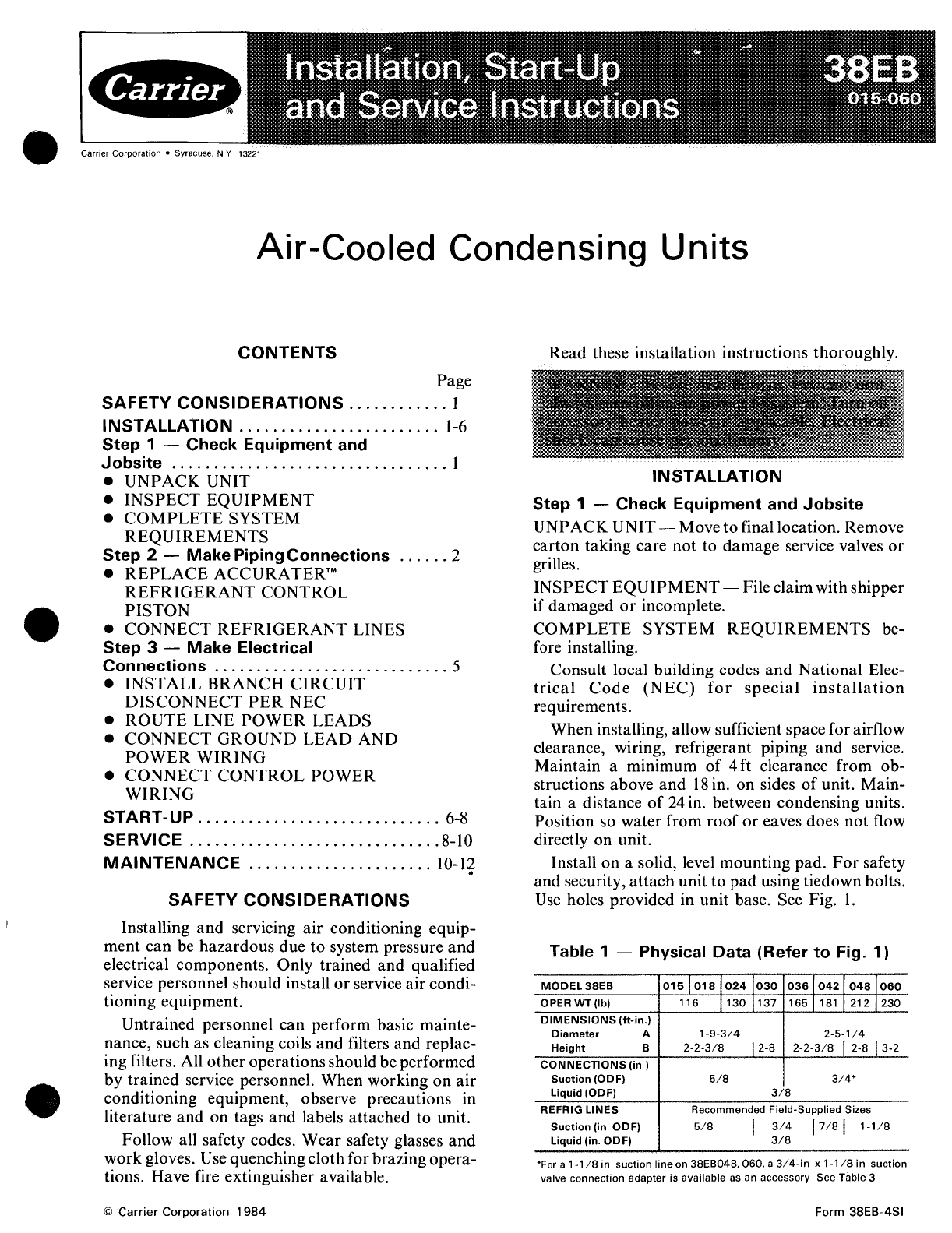 Carrier Air Cooled Condensing Units 38Eb Users Manual