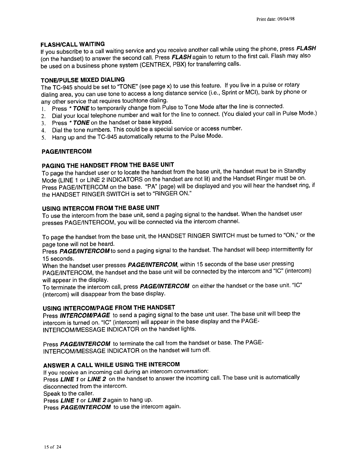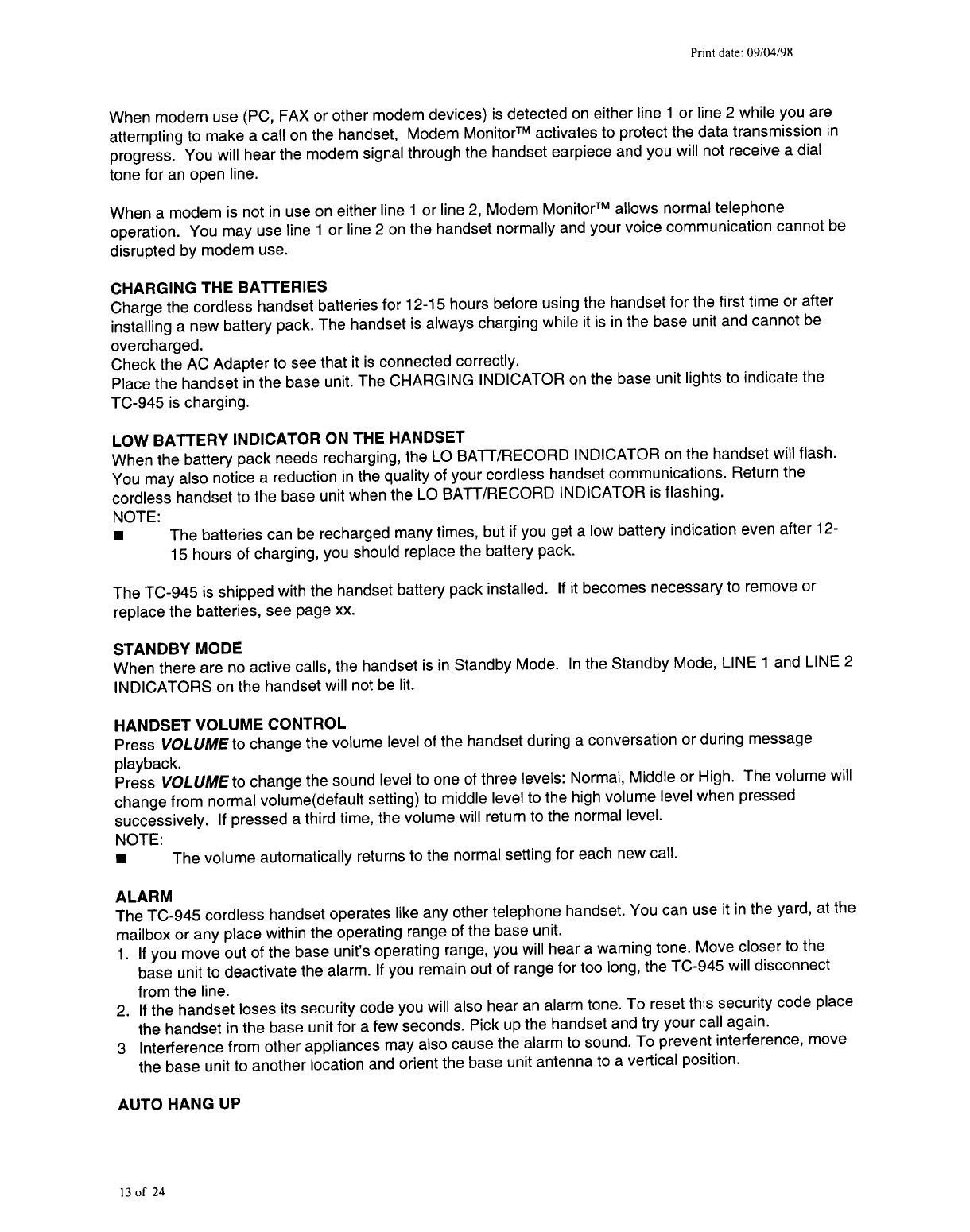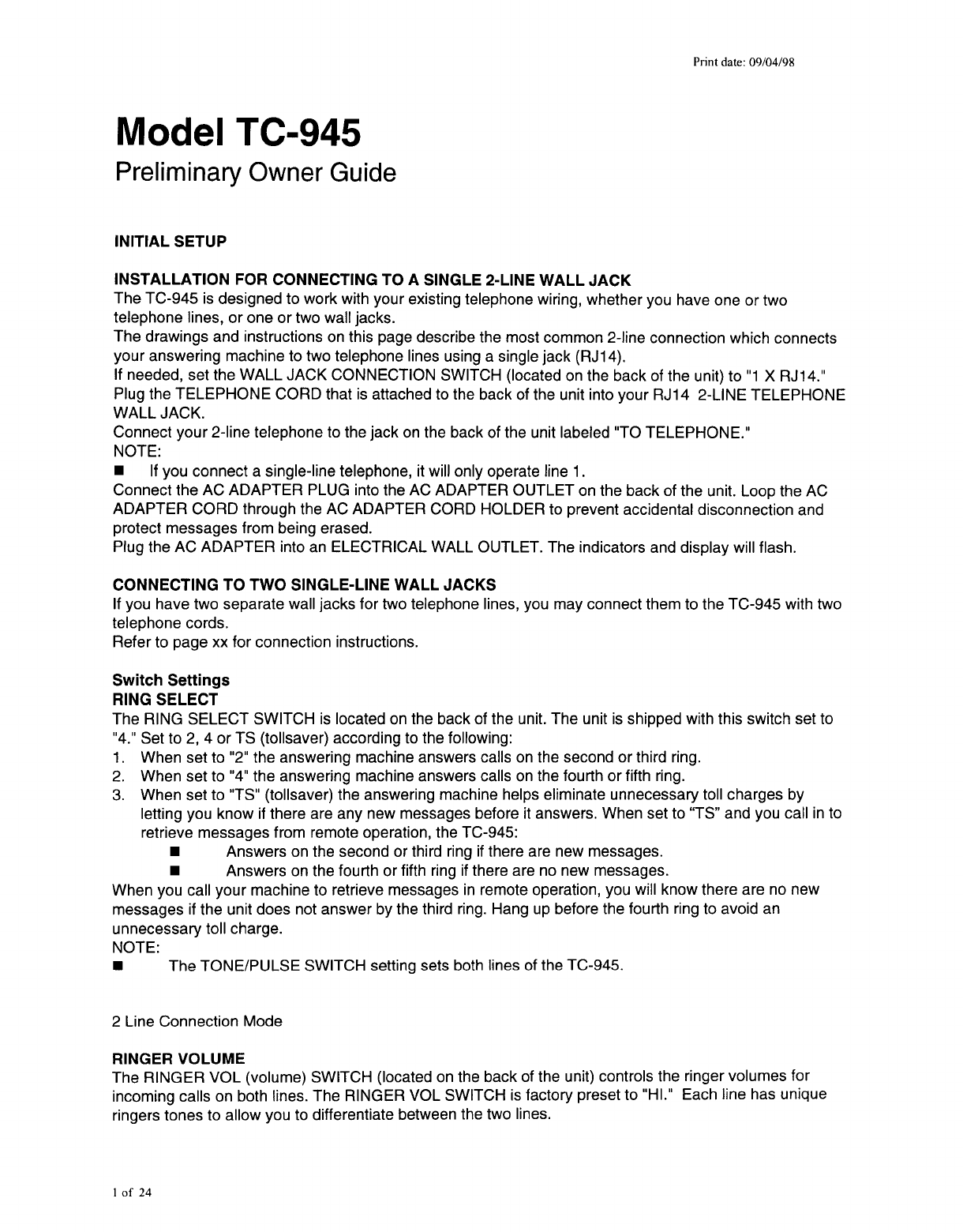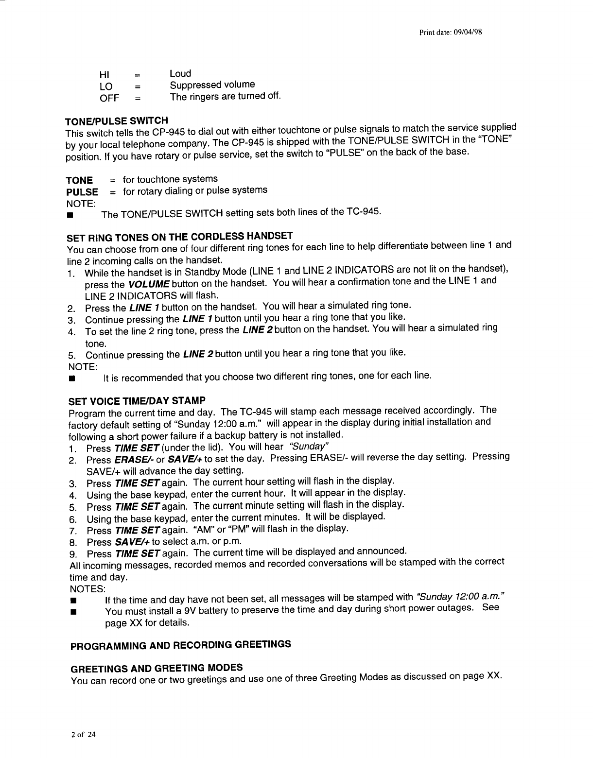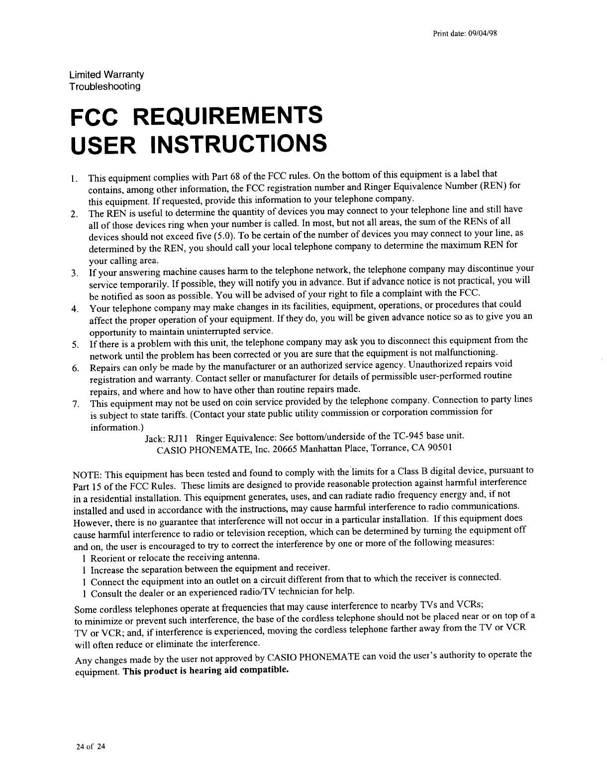 Casio Communication TC-945 900 MHz Cordless Telephone User Manual Owners Manual