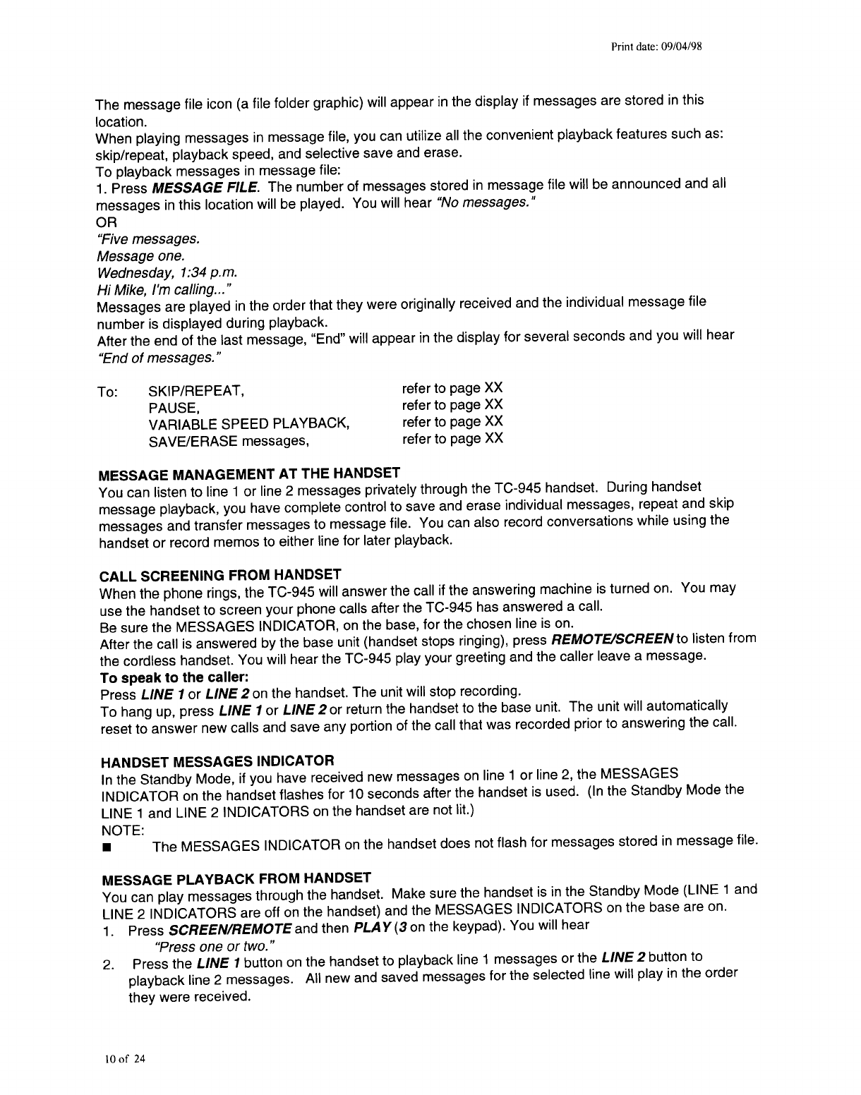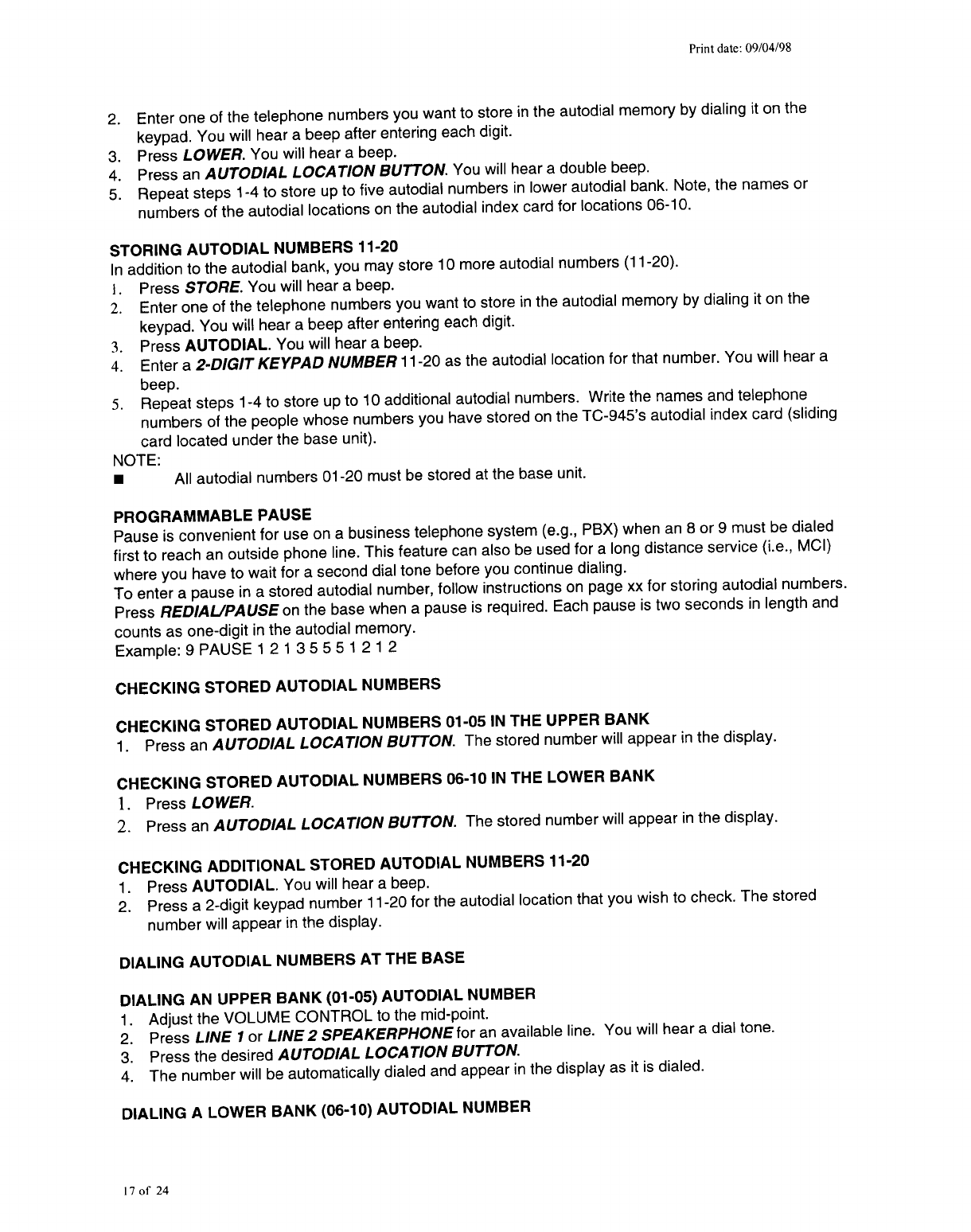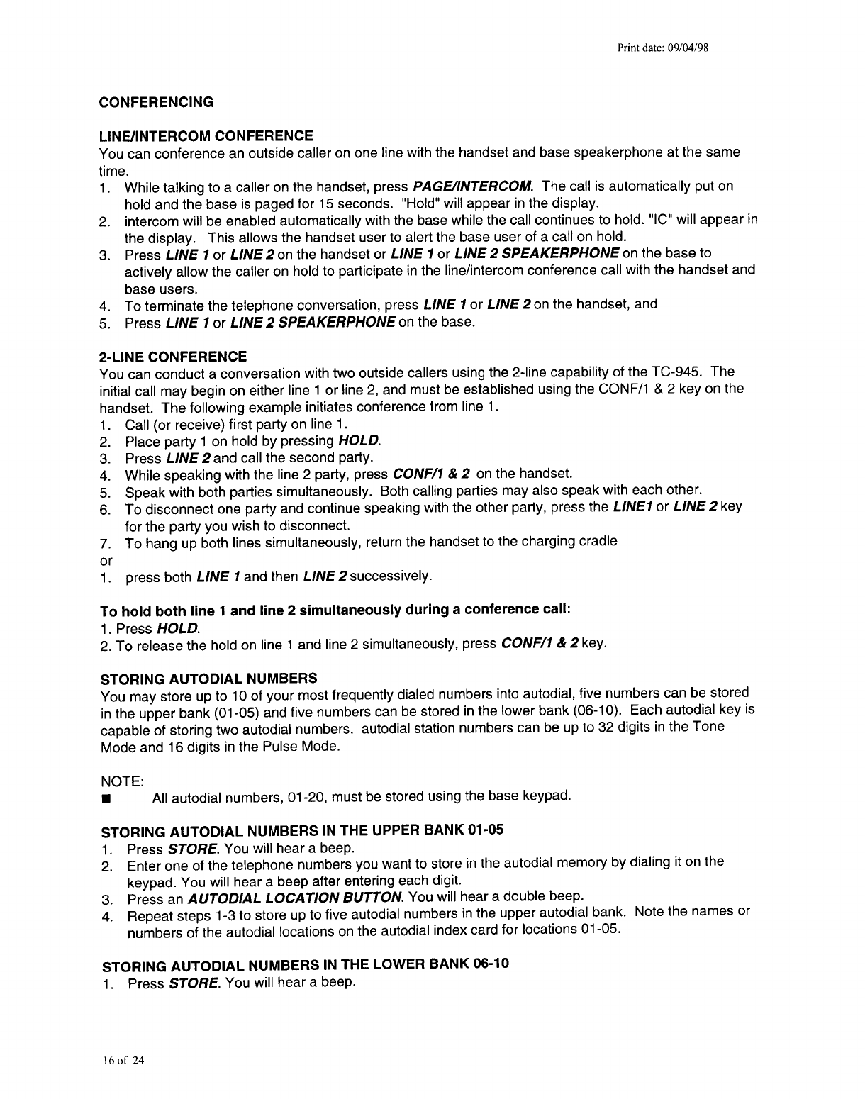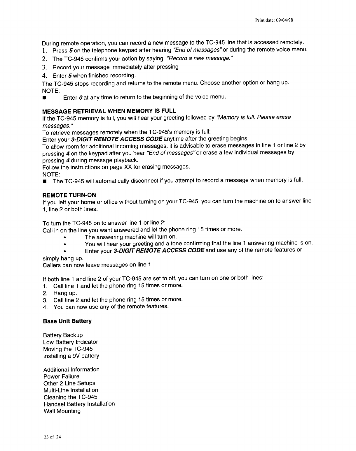Casio Communication TC-945 900 MHz Cordless Telephone User Manual Owners Manual