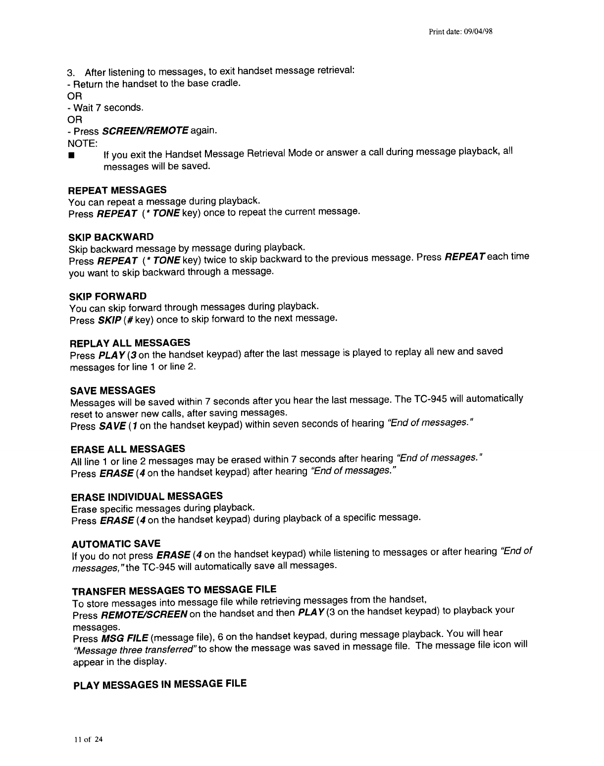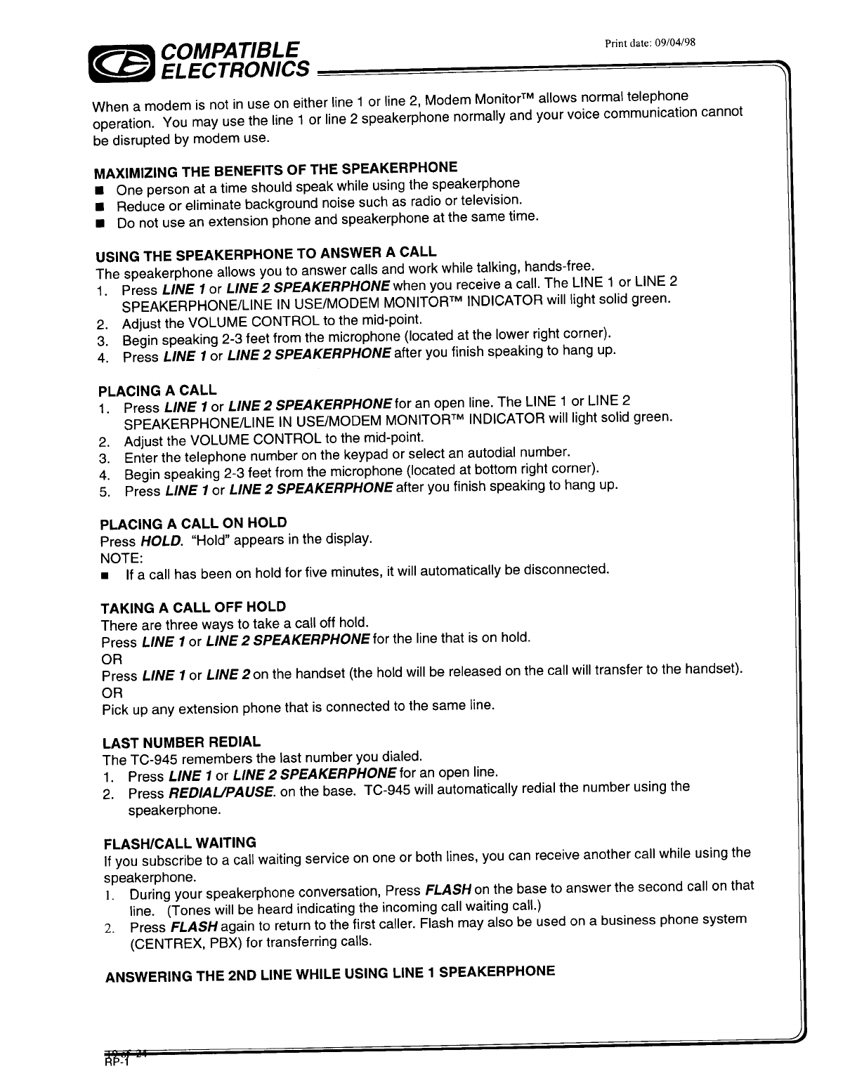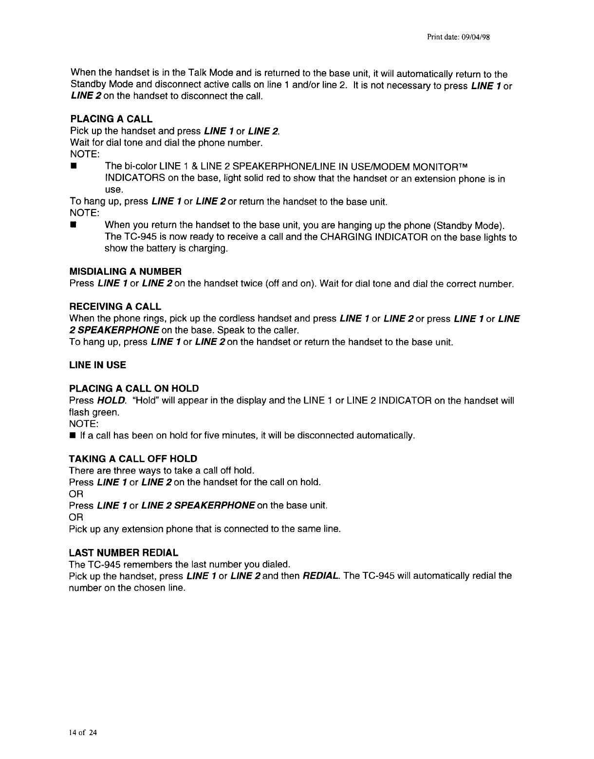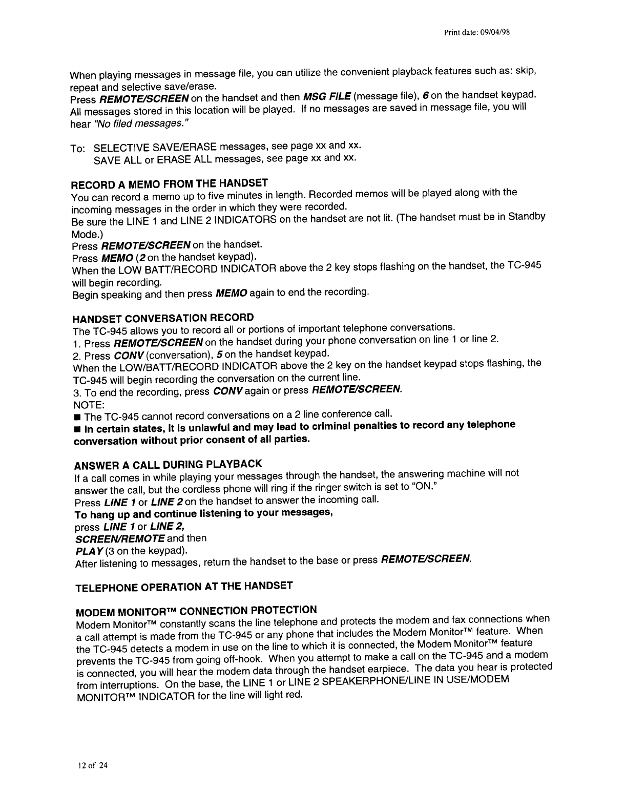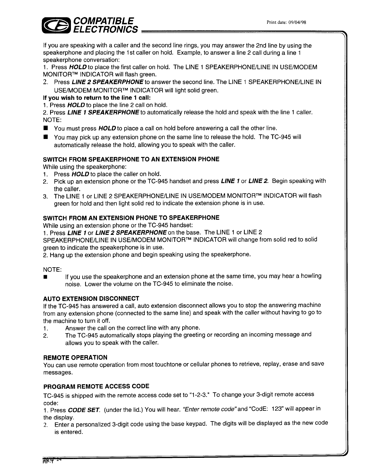 Casio Communication TC-945 900 MHz Cordless Telephone User Manual Owners Manual