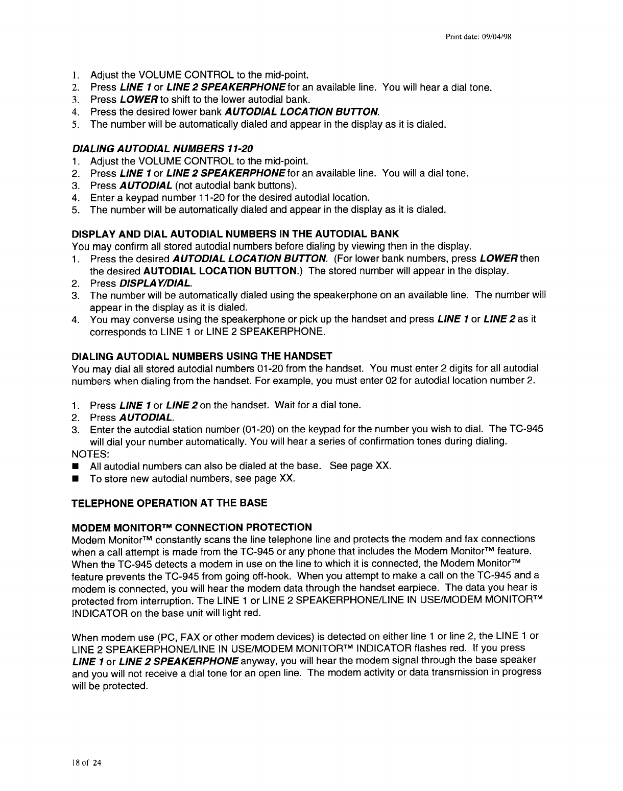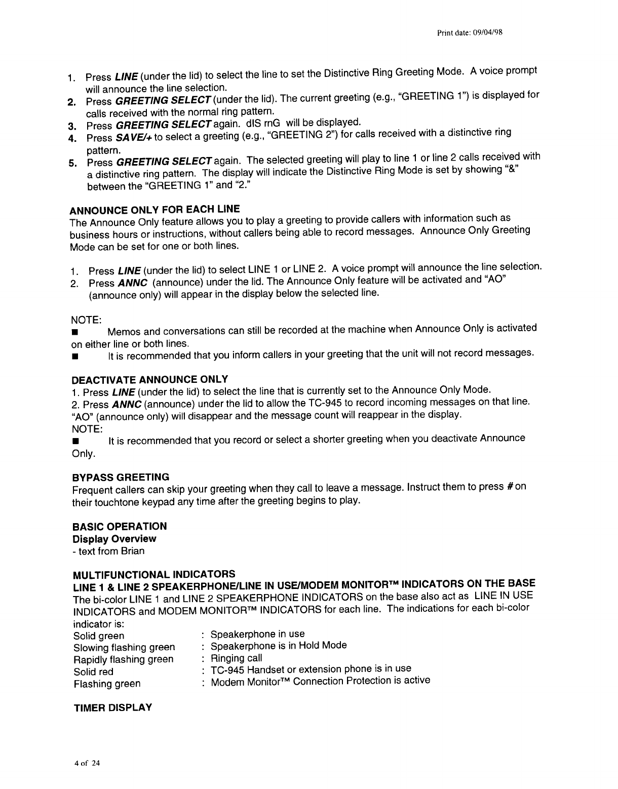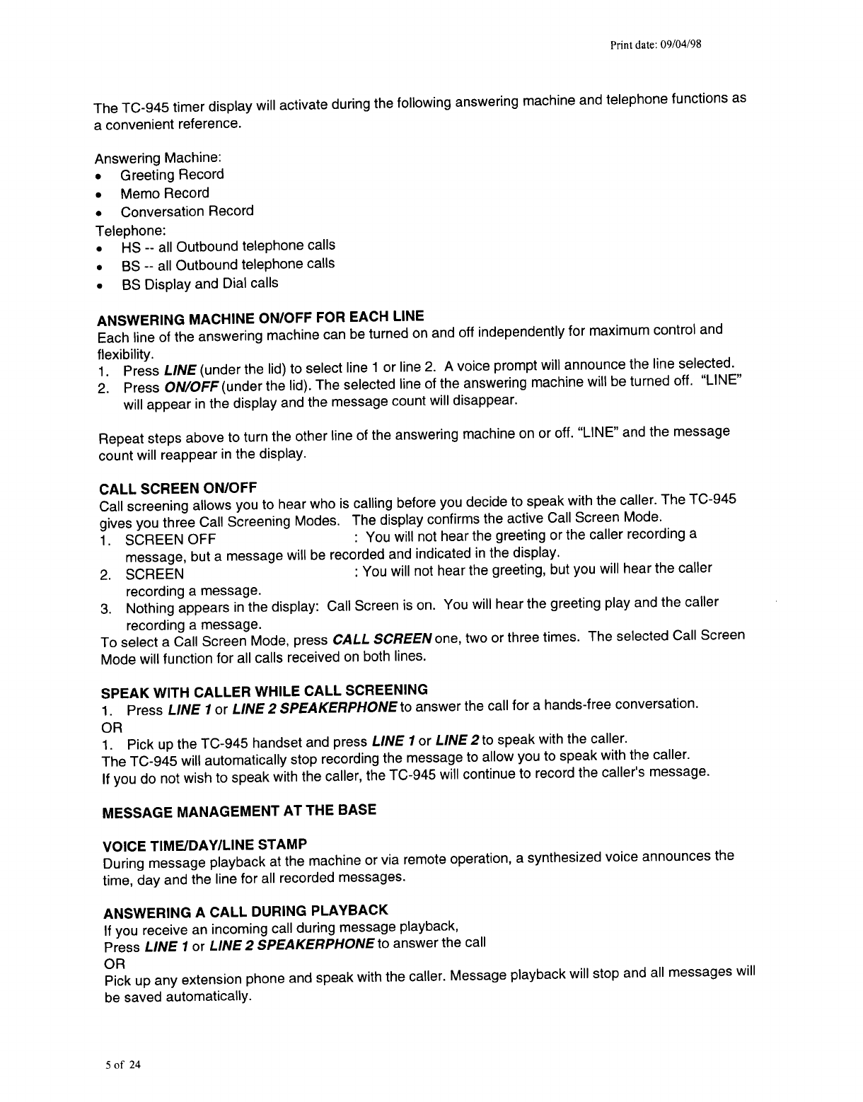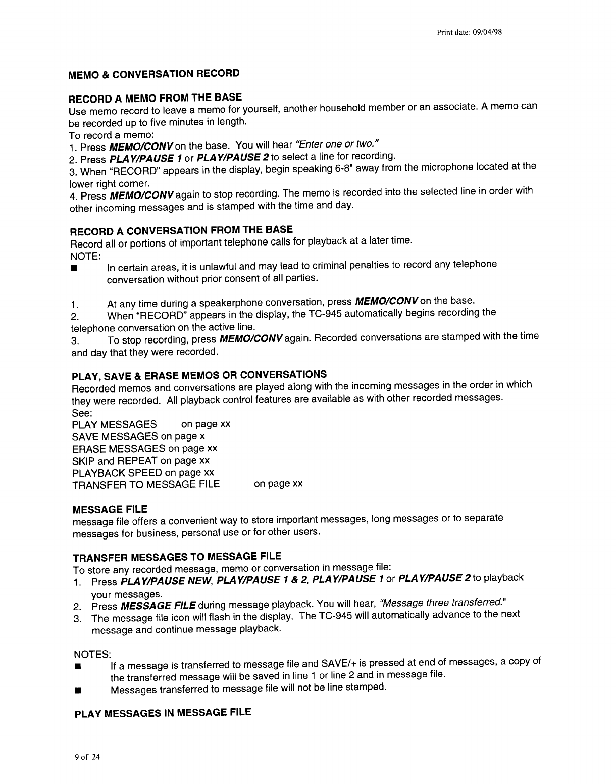 Casio Communication TC-945 900 MHz Cordless Telephone User Manual Owners Manual