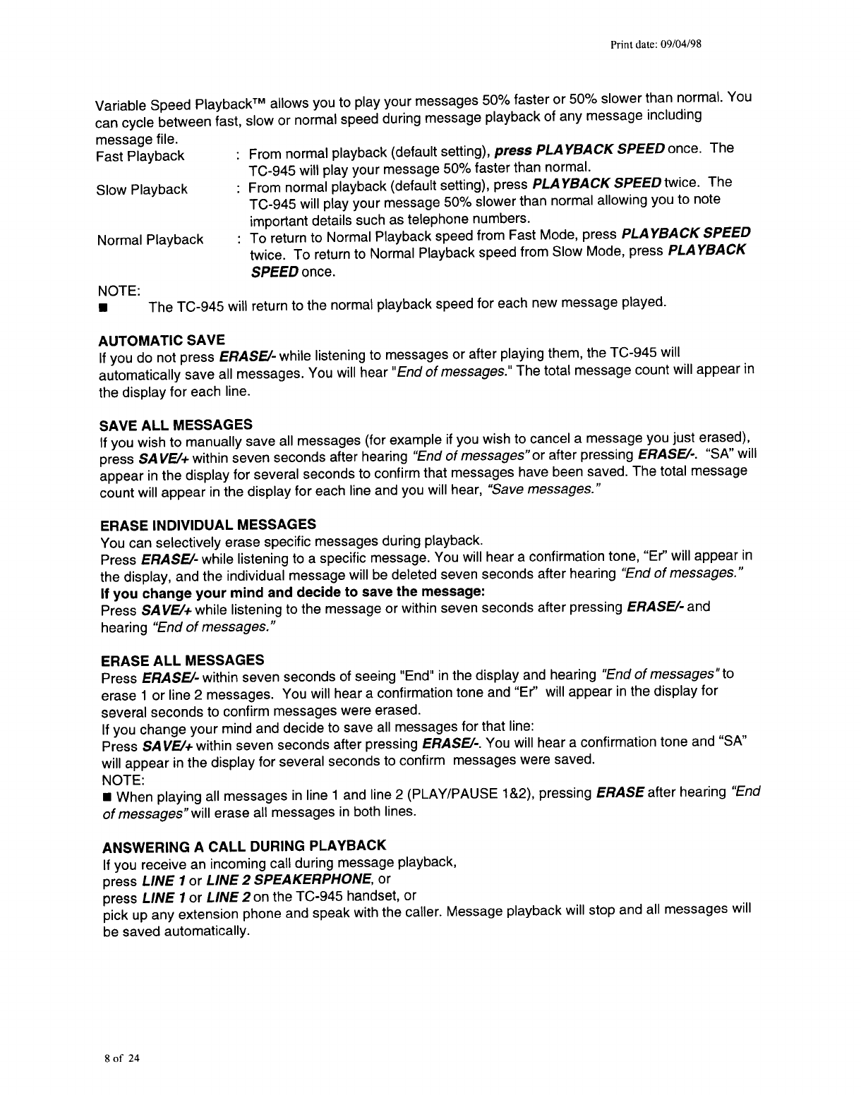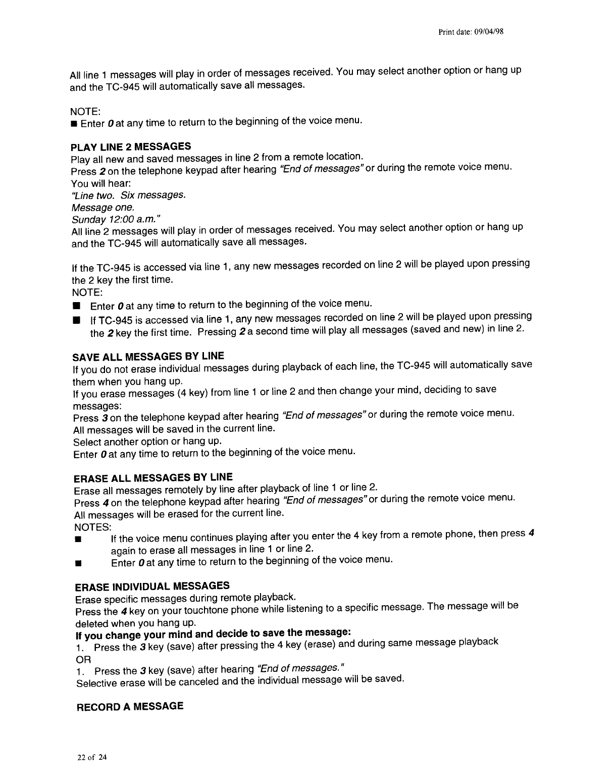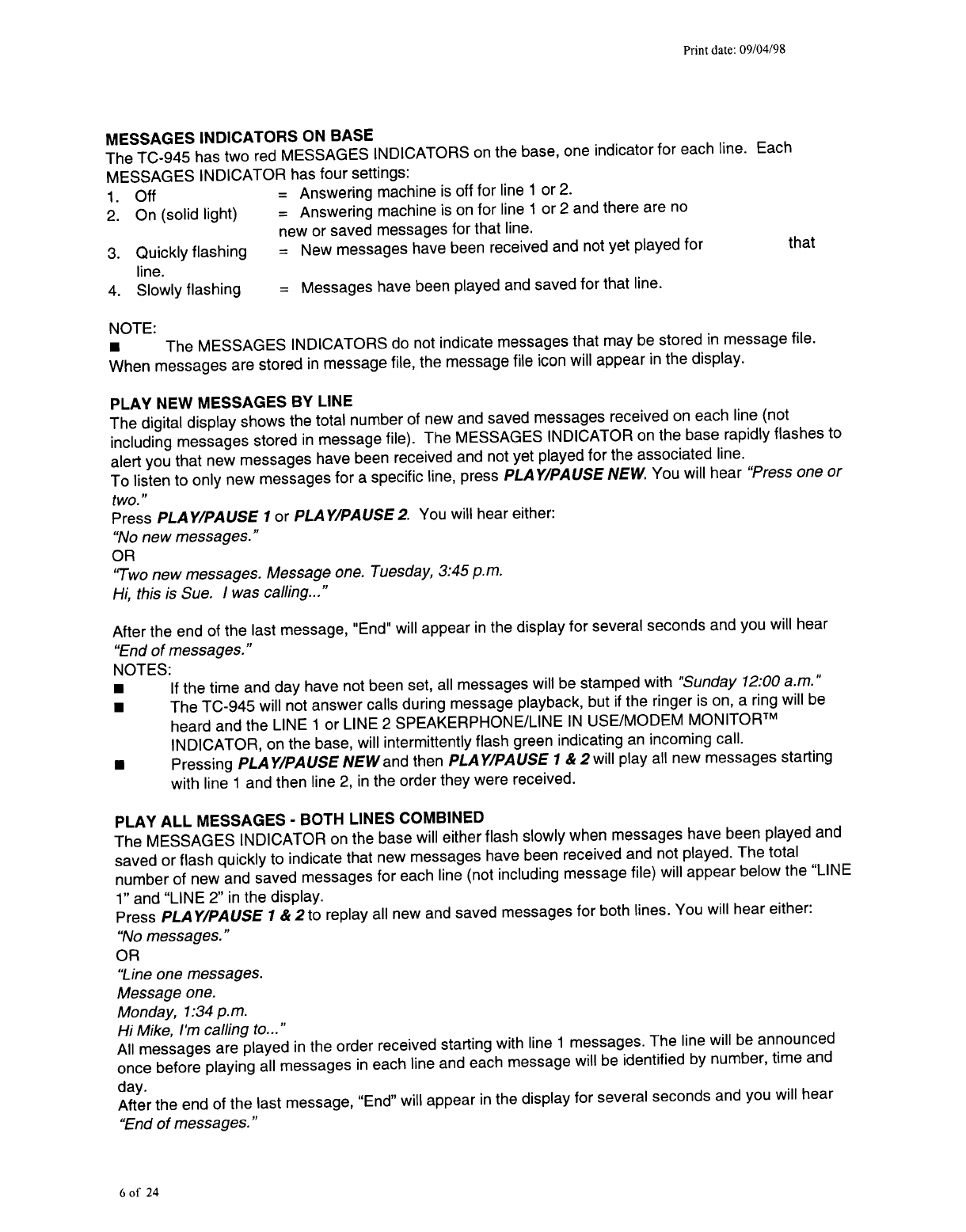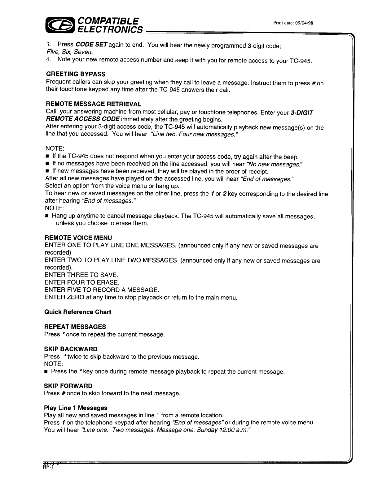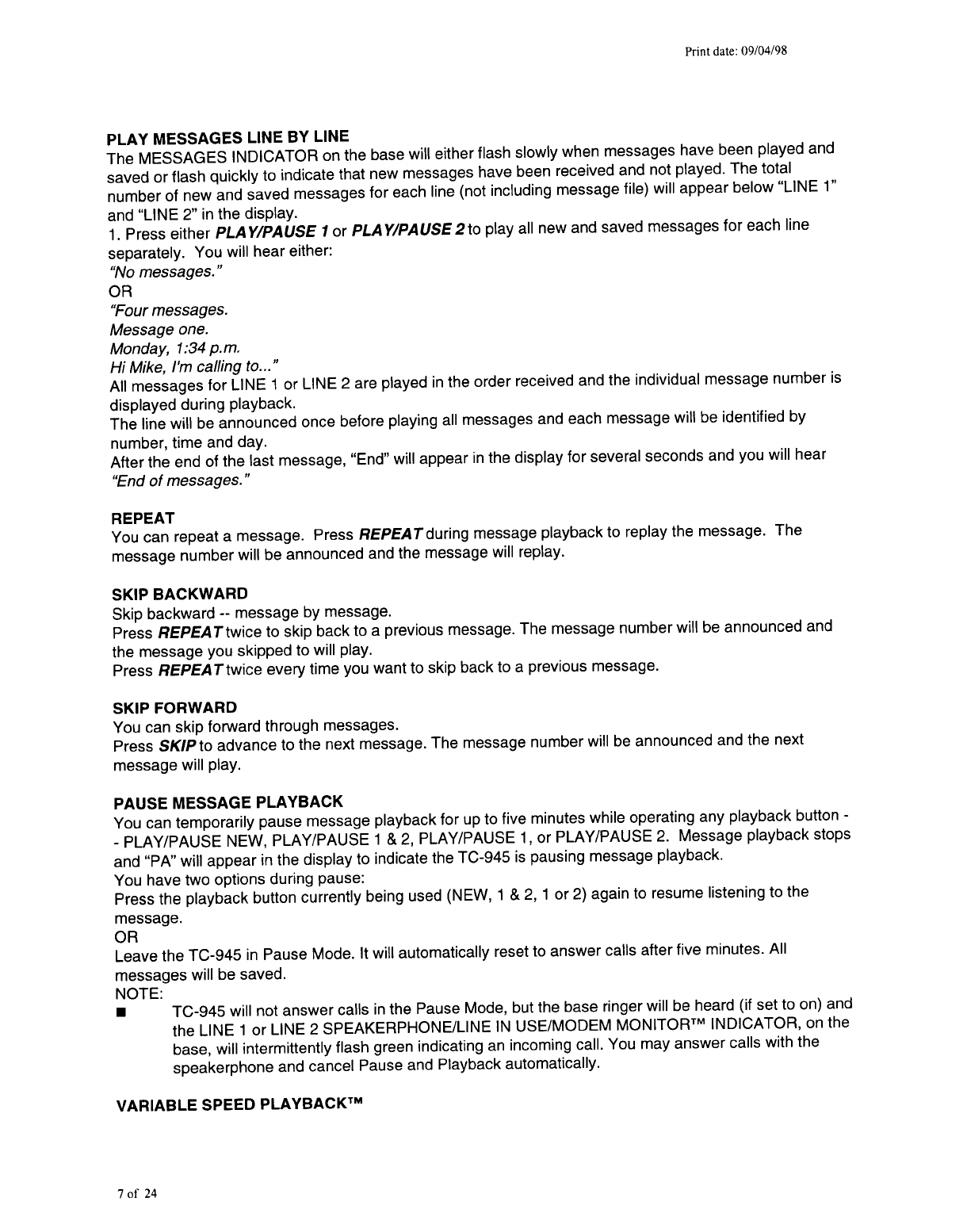 Casio Communication TC-945 900 MHz Cordless Telephone User Manual Owners Manual
