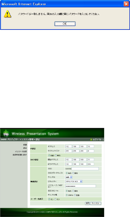パスワードを正しく入力してください。 パソコンからプロジェクターのシステム管理画面にログインしようとし
