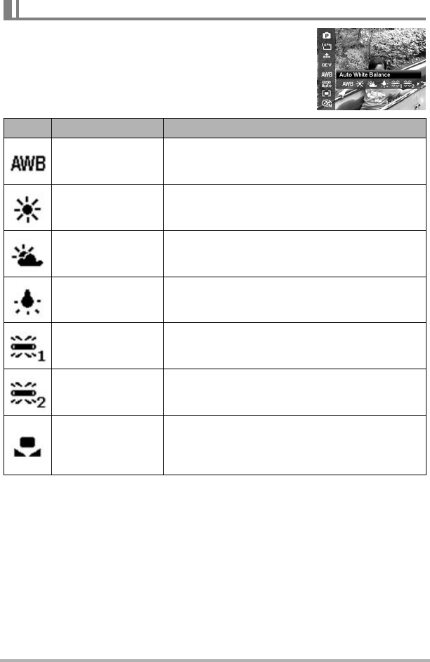 White Balance Auto, Daylight, Cloudy, Tungsten, Fluorescent 1, Fluorescent 2,