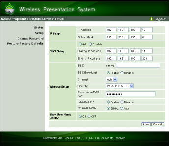 default SSIDs for three of the projectors and configure