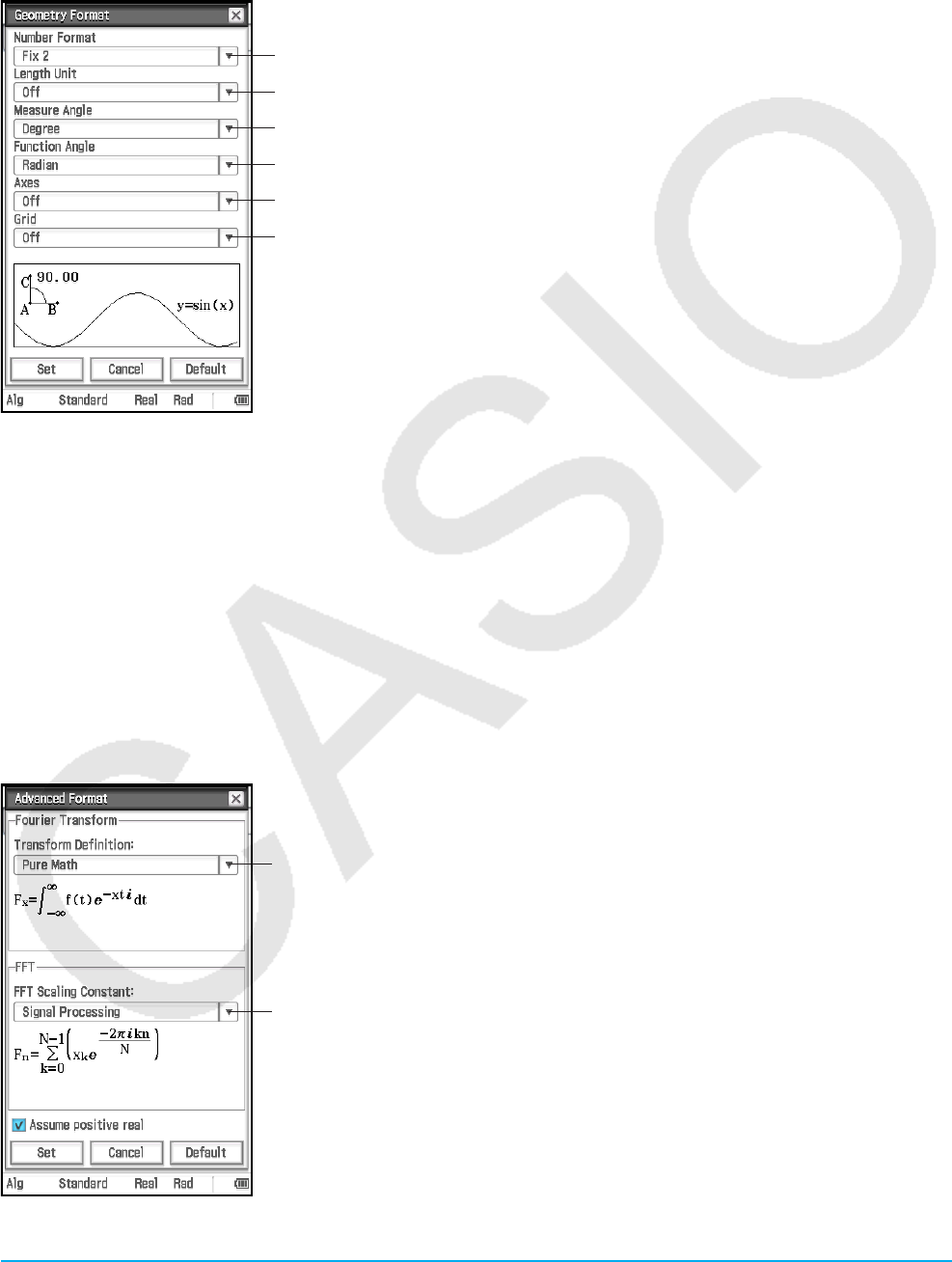 Geometry Format: Number Format, Length Unit, Measure Angle, Function Angle
