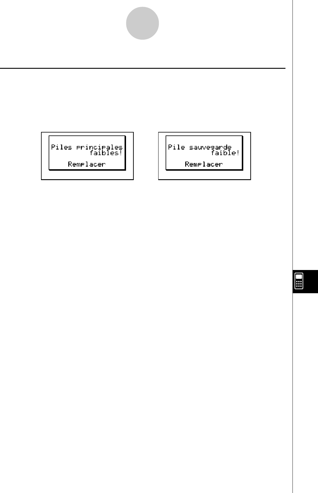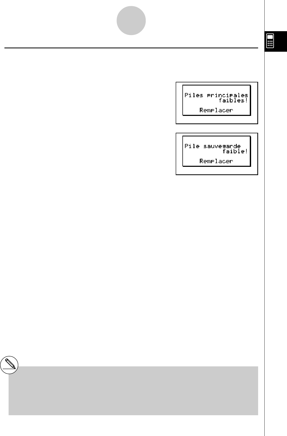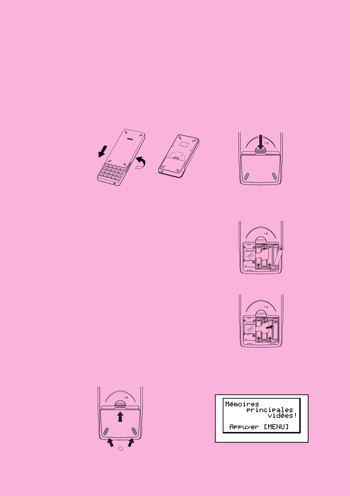 * Ne mettez pas la calculatrice sous tension lorsque les piles principales ont été enlevées de