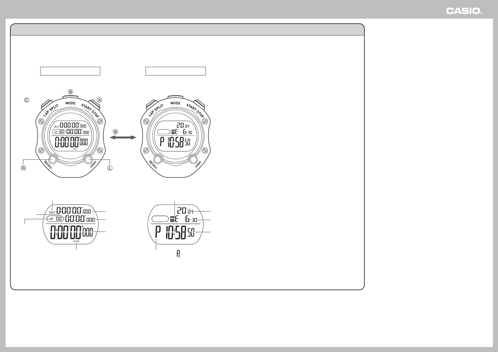 Bボタンを押すごとにストップウオッチモードと時刻・カレンダーモードが切り替わります。詳しくは各機能の項目をご覧ください。