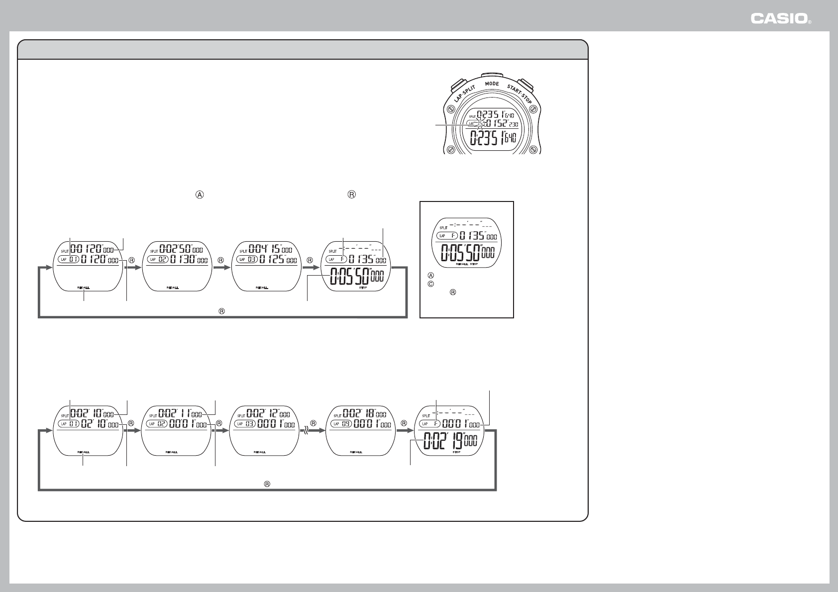 Cボタンを押し計測したラップ及びスプリットは、Rボタンを押すごとに順に呼び出すことができます。