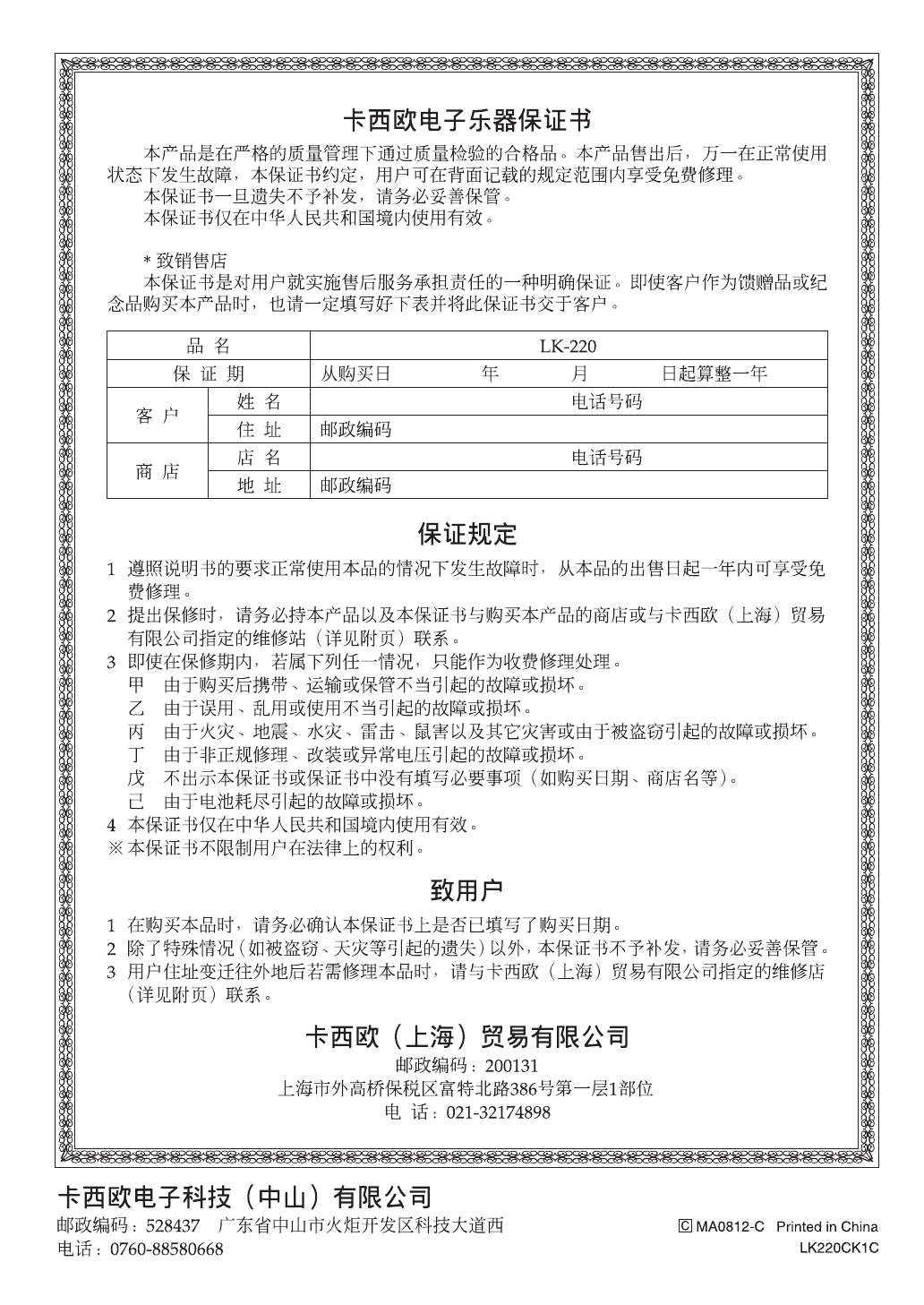 User Manual: Casio LK220 LK-220 | 电子乐器 | 说明书 | CASIO