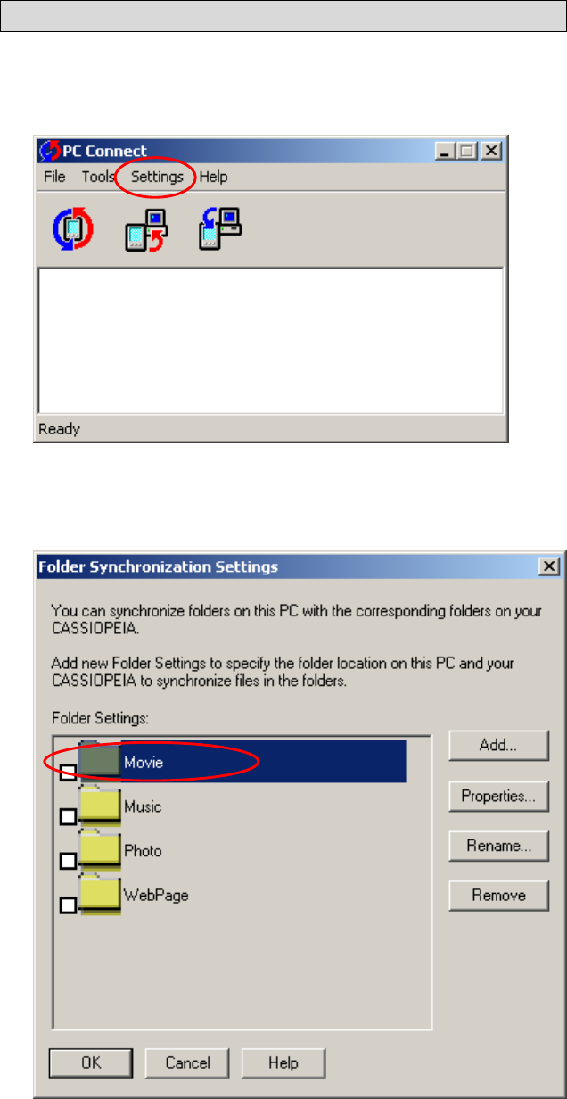 (1) On the PC Connect window, click "Settings" and then "Folder Synchronization