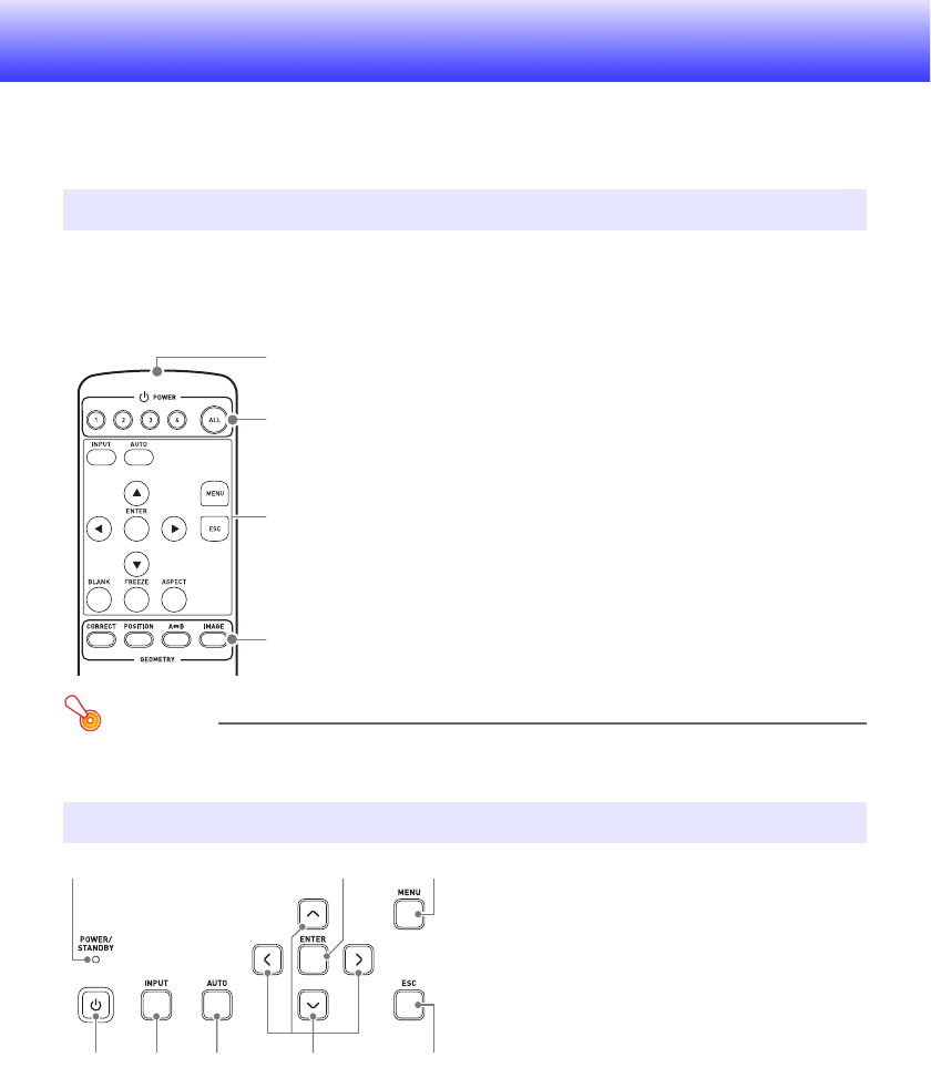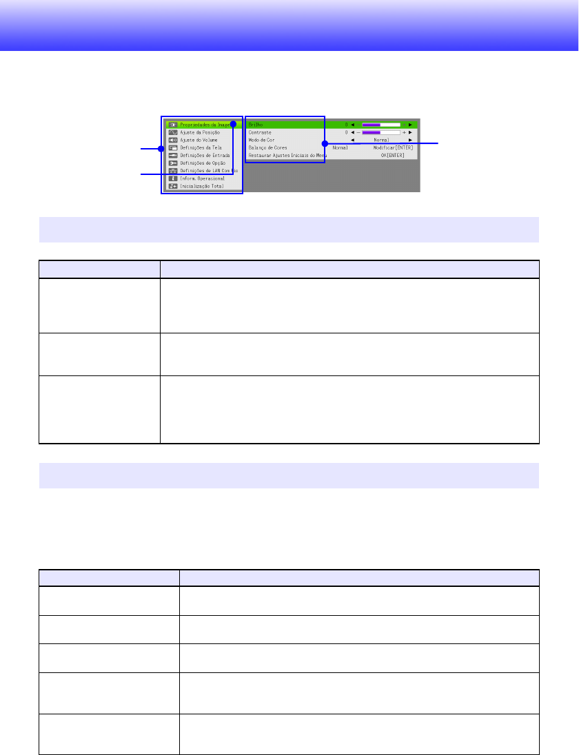 itens de definição em uma caixa de diálogo ou menu exibido na tela de projeção. Use estas teclas