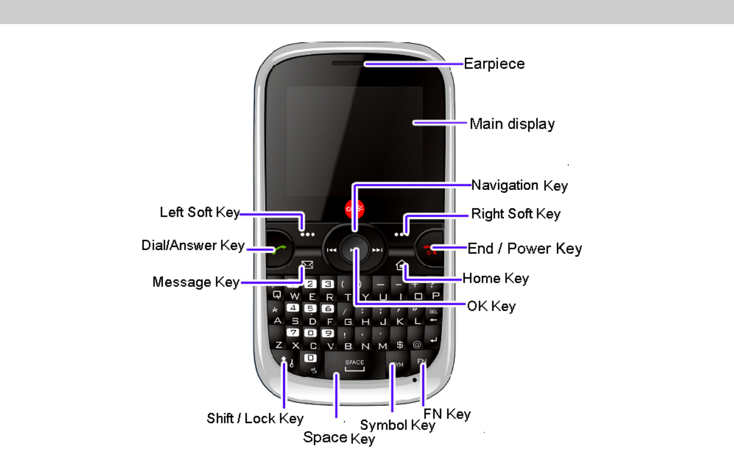 Left Soft Key In idle mode, press to enter the Main menu. Press to access the option listed directly