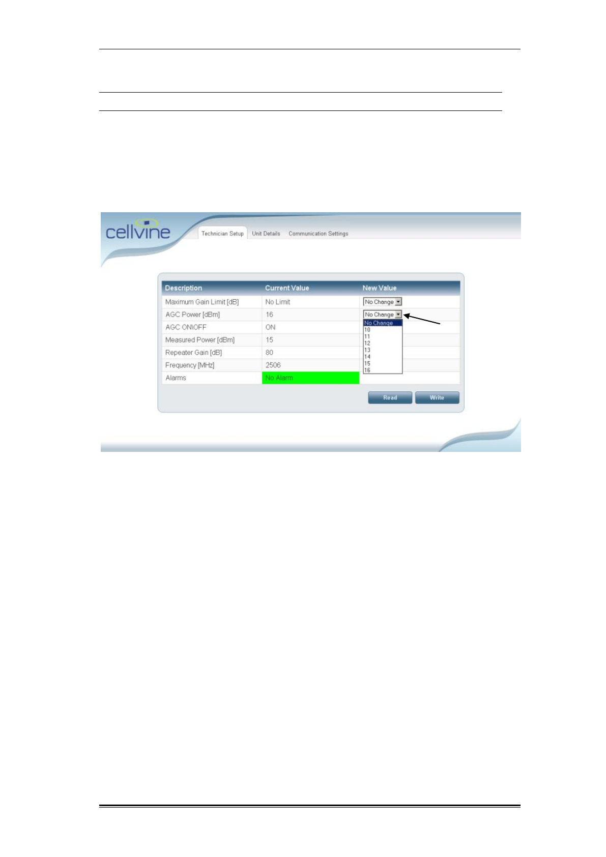 Example: The AGC power is set to 16 dBm and the Forward Power readout in