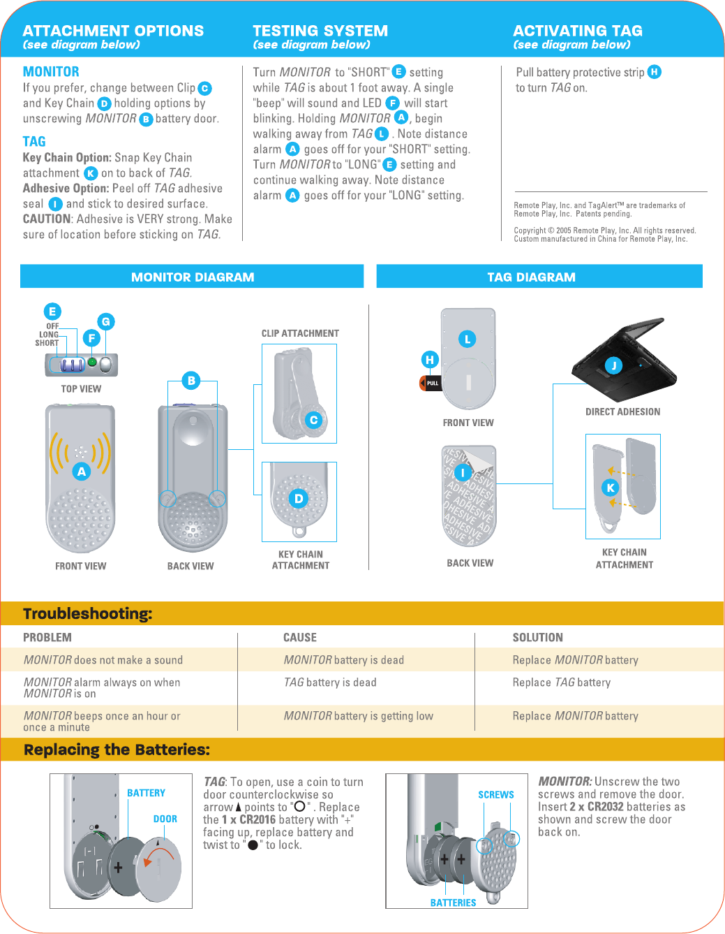 RemotePlay, Inc. warrants to the original purchaser that this product (TagAlert™), is free from material and workmanship defects